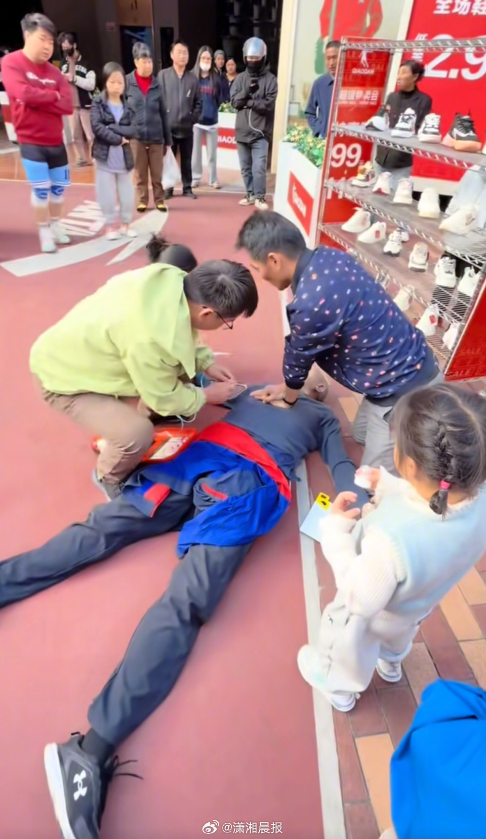 益田假日奥特莱斯商场的工作人员告诉记者,客人当时在篮球场打球,倒地后同伴赶紧施救,商场第一时间派去了工作人员,“当时不知道发生了什么就没带AED,现场的一名客人是医护,她问了一嘴,我们也赶紧去前台取了过来。”