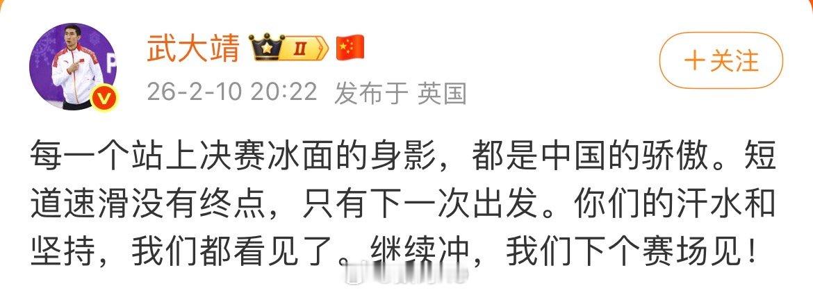 孙龙失误2026米兰冬奥会短道速滑2000米混合接力A组决赛,孙龙失误,中国队排名第四,无缘奖牌。前短道速滑名将武大靖发文鼓励:“每一个站上决赛冰面的身影,都是中国的骄傲。短道速滑没有终点,只有下一次出发。你们的汗水和坚持,我们都看见了。继续冲,我们下个赛场见!”