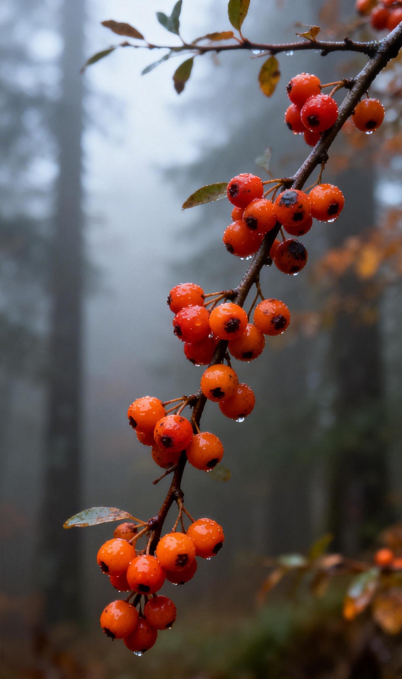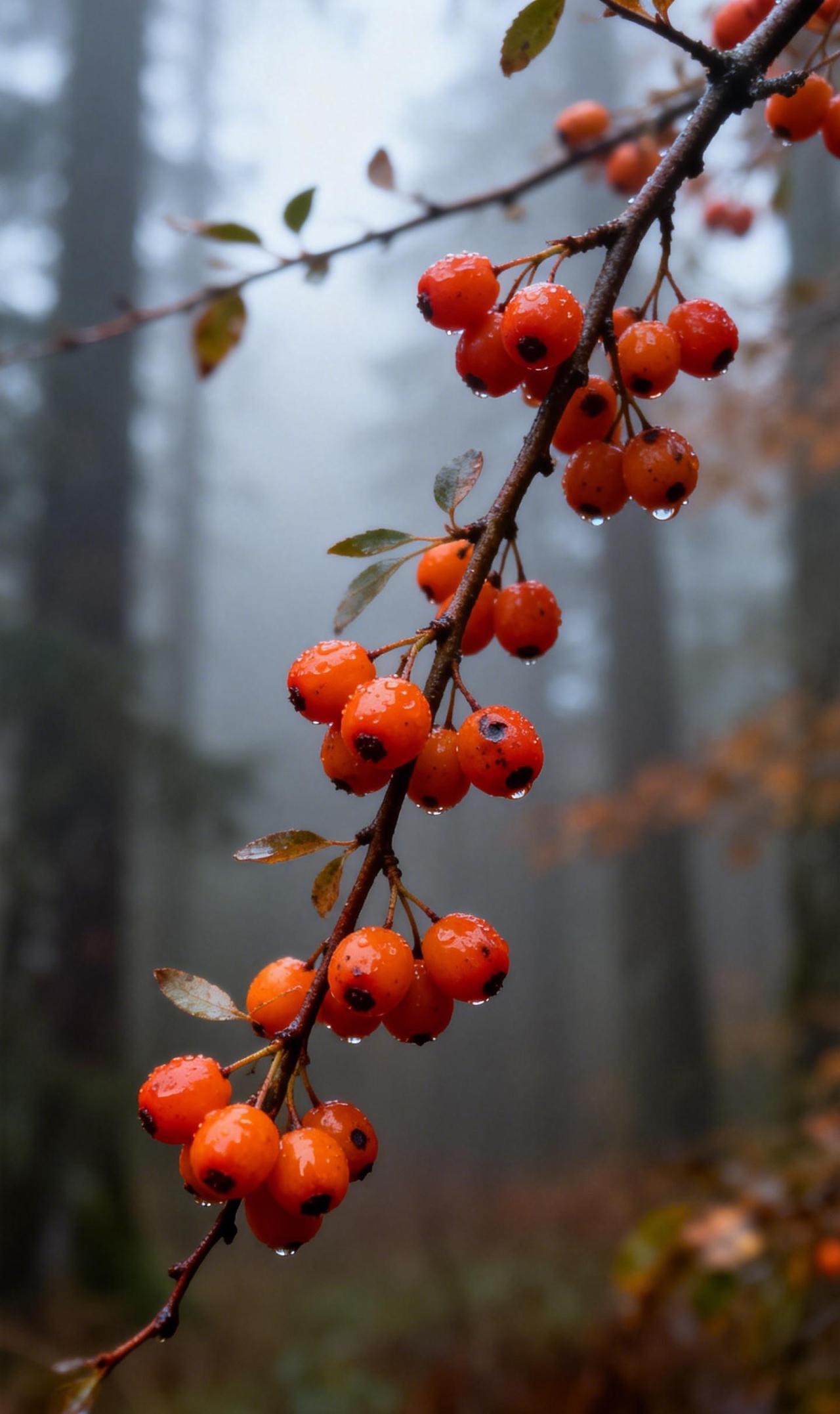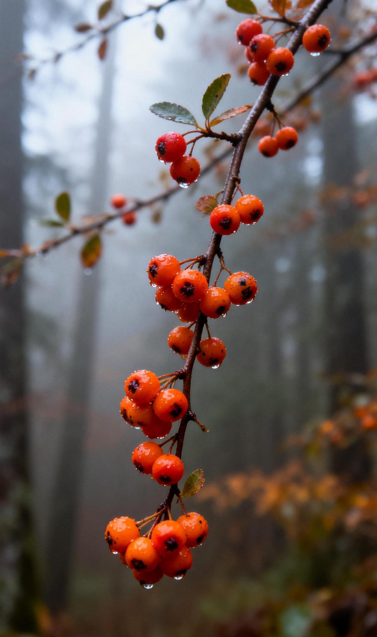 雾果:只留下颜色在呼吸 薄雾在林木间游移,将秋晨调成半透明的灰调。就在这片湿润的朦胧里,一簇火棘果蓦然点亮视线——饱满的橙红浆果攒在深褐枝头,每一颗都托着圆润的露,坠得枝条微微弯下。风经过时,整串果实轻轻摇晃,水珠沿着果皮滑落,在叶尖短暂停留,最终跌进雾里,漾开看不见的涟漪。 雾气缠绕着果实鲜亮的暖,像一层柔软的薄纱覆盖着倔强的生机。水汽在林间缓缓流动,带走了所有声响,只留下颜色在呼吸:枝条的沉静、浆果的明艳、雾气的通透,交织成一首清冷却温柔的秋日晨曲。 果实之美 发现身边美好