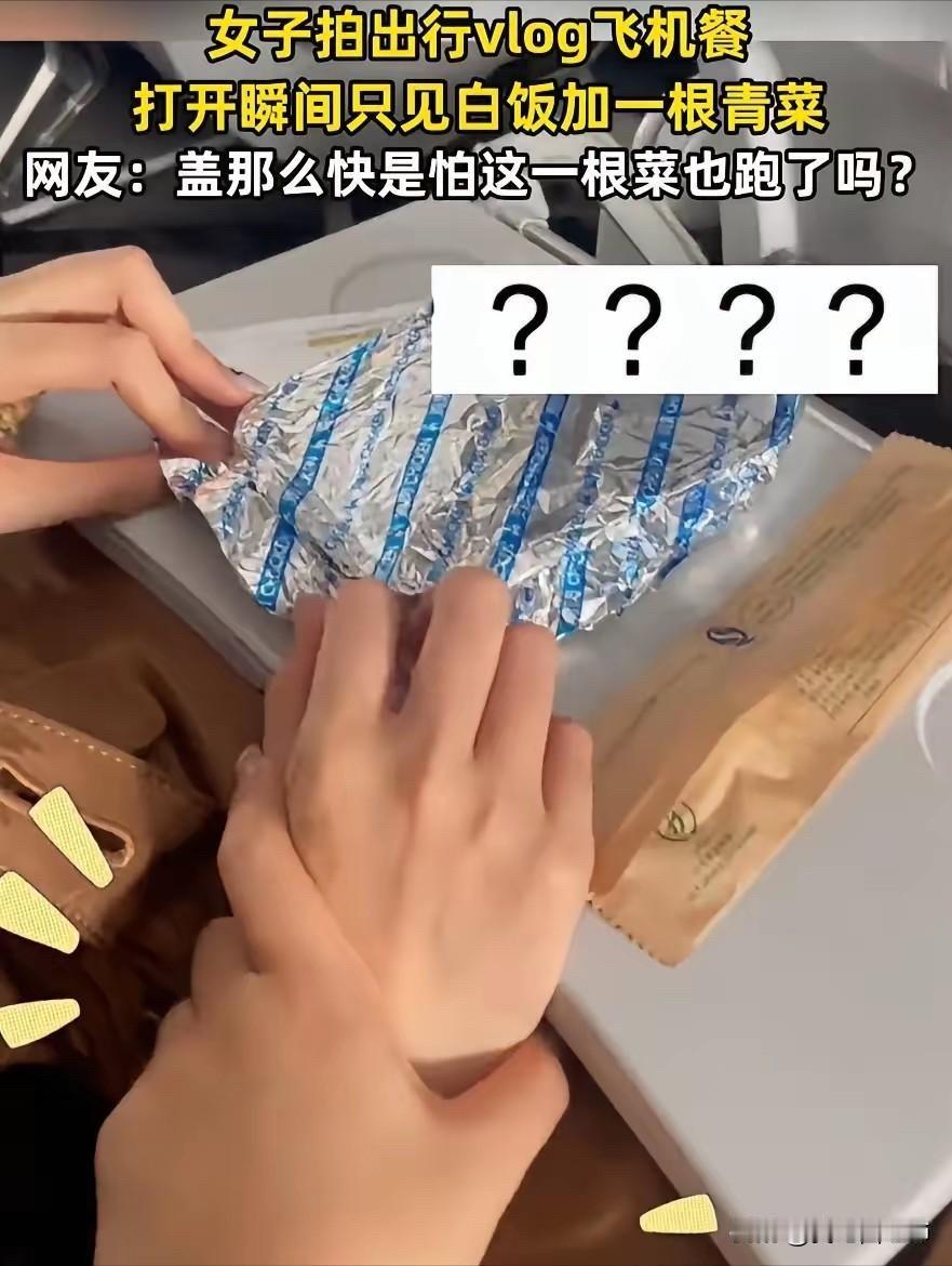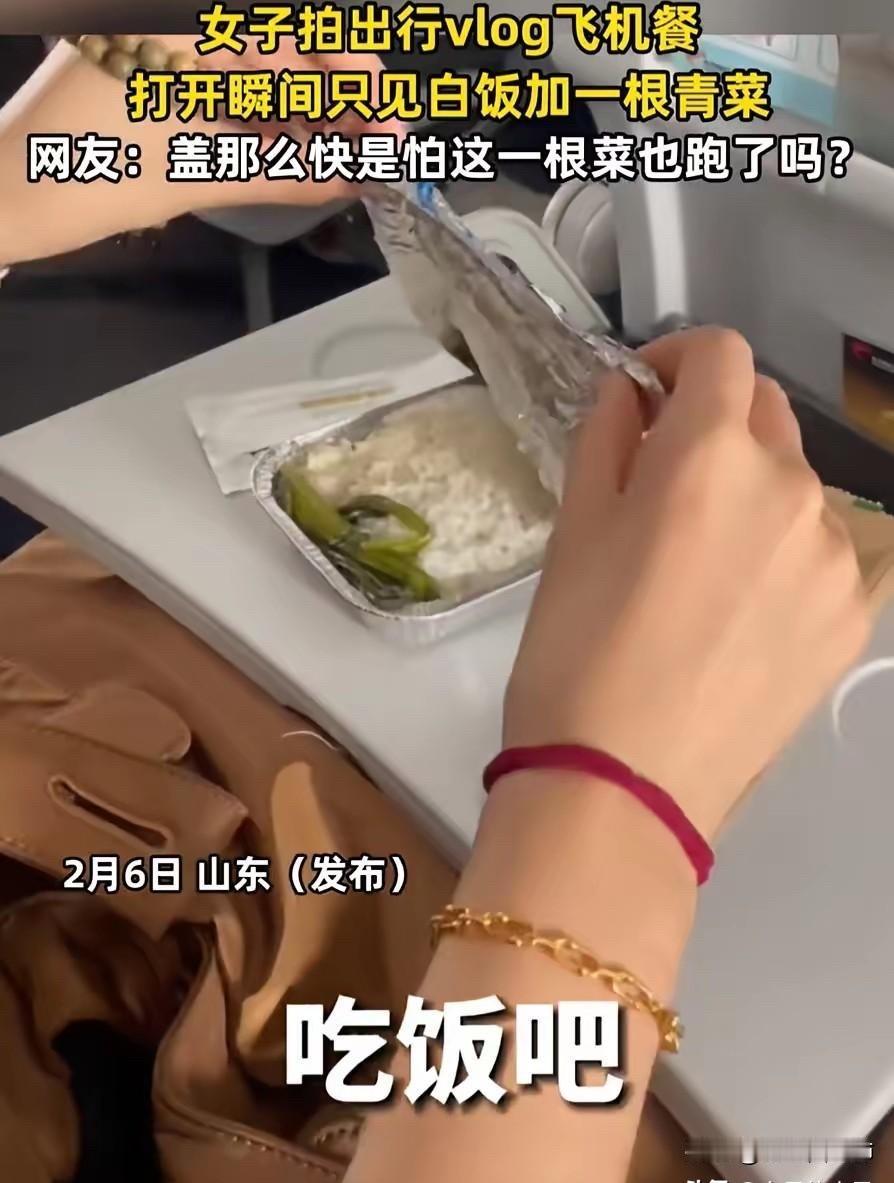 伤害性不高侮辱性极强!山东,一女子坐飞机出行,飞机起飞不久空姐就端上来飞机餐,万万没想到,女子把盖子打开一看,里面就只有一碗饭加一根青菜,吓得女子连忙盖上了盖子。网友:盖那么快是怕这一根菜也跑了吗? 2026年2月7日,山东这位女子趁着闲暇时间,乘坐国内某航班出行,至于具体的航班号和出行目的地,女子并没有在视频中透露。 据女子后续在评论区补充,她当天买的是普通经济舱机票,不算廉价航空的特价票,所以登机的时候,就默认飞机上会提供免费的热餐。 毕竟不管是以前坐飞机的经历,还是身边朋友的反馈,普通航班的飞机餐,就算不算丰盛,至少也会有主食、小菜,偶尔还会搭配水果或者小点心,所以她从登机开始,就隐约期待着这份飞机餐。 飞机顺利起飞后,大概平稳飞行了半个小时左右,空乘人员就推着餐车,开始逐一向乘客分发飞机餐,女子坐在靠窗的位置,看着餐车慢慢靠近,还特意整理了一下面前的小桌板,做好了吃餐食的准备。 空乘人员递来餐盒的时候,还笑着说了一句“请慢用”,女子接过餐盒,手感还是温热的,心里还暗自想着,看来这份餐食应该还不错,至少是热乎的,能缓解一下旅途的疲惫。 可当她轻轻掀开餐盒盖子的那一刻,整个人都愣住了,脸上的期待瞬间消失不见,取而代之的是一脸的惊讶,甚至下意识地就快速合上了盖子,动作快到连自己都没反应过来。 女子后来回忆说,当时完全是本能反应,打开盖子看到里面的样子,第一反应就是“是不是拿错餐盒了”,或者“是不是还有另外一份没递过来”,毕竟这样的飞机餐,她从来没见过,也从来没听说过。 女子缓过神来之后,又小心翼翼地把盖子掀开一条缝,确认了一下,里面确实只有满满的一碗白米饭,旁边孤零零地放着一根青菜,没有任何其他小菜,没有肉,没有蛋。 甚至连一点咸菜或者酱料都没有,那根青菜细细小小的,大概只有手指那么长,颜色倒是还算新鲜,却显得格外突兀。 女子无奈之下,就把这一幕用手机拍了下来,没有添加任何多余的文案,只简单配了一句“不敢睁开眼,希望是我的幻觉”,然后发布到了网络上,没想到短短几个小时,就引发了全网热议。 视频走红之后,很快就吸引了大量网友的围观和评论,评论区瞬间就炸了锅,大家的看法不一,有人觉得特别好笑,有人则表示自己也有过类似的经历。 最热门的一条评论就是“盖那么快是怕这一根菜也跑了吗?”,这句话很快就被网友们争相转发,成为了调侃这件事的热门话术。 还有网友开玩笑说,这根青菜绝对是“C位出道”,独享一碗米饭,待遇比谁都好,也有网友吐槽,这样的飞机餐,还不如不吃,简直是侮辱人,就算是简餐,也不至于寒酸到这种地步。 有不少网友质疑,女子的视频是不是摆拍,毕竟就算飞机餐再简单,也不至于只有一根青菜,还有网友猜测,女子可能乘坐的是廉价航空,而廉价航空大多不提供免费餐食,或者只提供极简餐食。 但女子很快就在评论区回应,自己买的不是廉价航空的机票,还补充说,当时掀开盖子的面积很大,一开始以为没有菜,后来仔细看才发现有一根,确实有菜,但跟没有几乎没区别。 有媒体联系到了相关航空公司的客服热线,客服工作人员表示,目前还没有收到相关的投诉反馈,同时还解释说,航空公司的配餐会根据航班线路、飞行时长、机型等因素略有不同。 通常情况下,不会出现只有一根青菜配米饭的情况,后续会进一步核实此事。其实熟悉航空行业的人都知道,近年来,不少航空公司为了降本增效,都在逐步缩减飞机餐的成本。 三大航的航空餐食费用占总营业成本的比例,相比几年前都有明显下降,旅客人均航空餐食成本也随之减少。 除此之外,还有网友晒出了自己之前乘坐飞机时遇到的极简飞机餐,有人说自己曾吃到过四个馒头加一包榨菜,还有人说吃到过一片白菜配米饭,这些吐槽也引发了不少人的共鸣。 据悉,早在2023年,就有消费者晒出类似的极简飞机餐,当时也引发了一阵热议,还有业内人士表示,目前国内对于航空公司的配餐,并没有统一的标准,餐食的种类、规格、成本等,都是由各航空公司自主规定的。 目前,女子吐槽飞机餐的事件,还在进一步发酵,相关航空公司也没有给出进一步的核实结果。女子表示,自己发布视频,并不是想故意抹黑航空公司,只是觉得这件事比较意外,随手记录分享一下,没想到会引发这么大的关注。