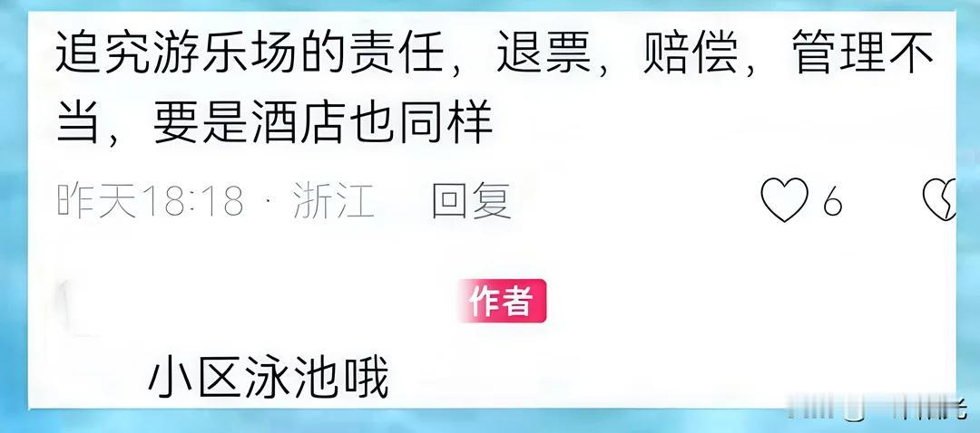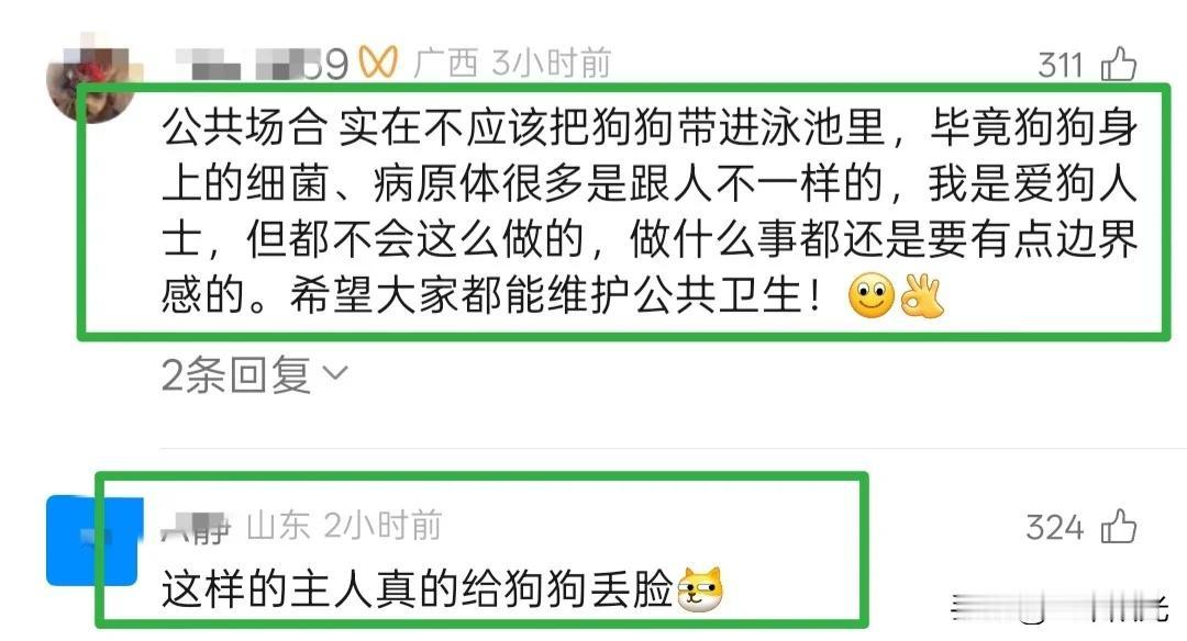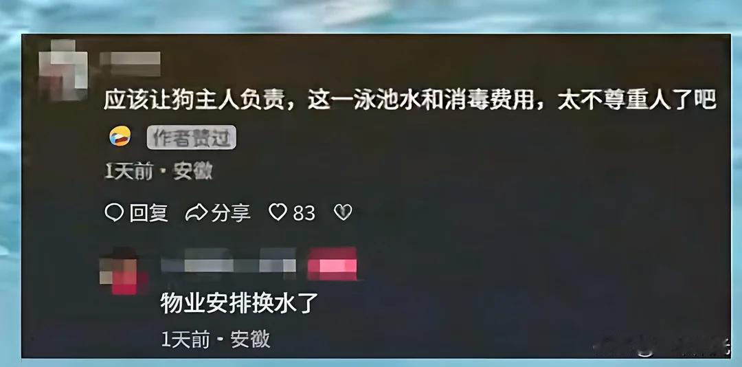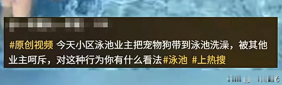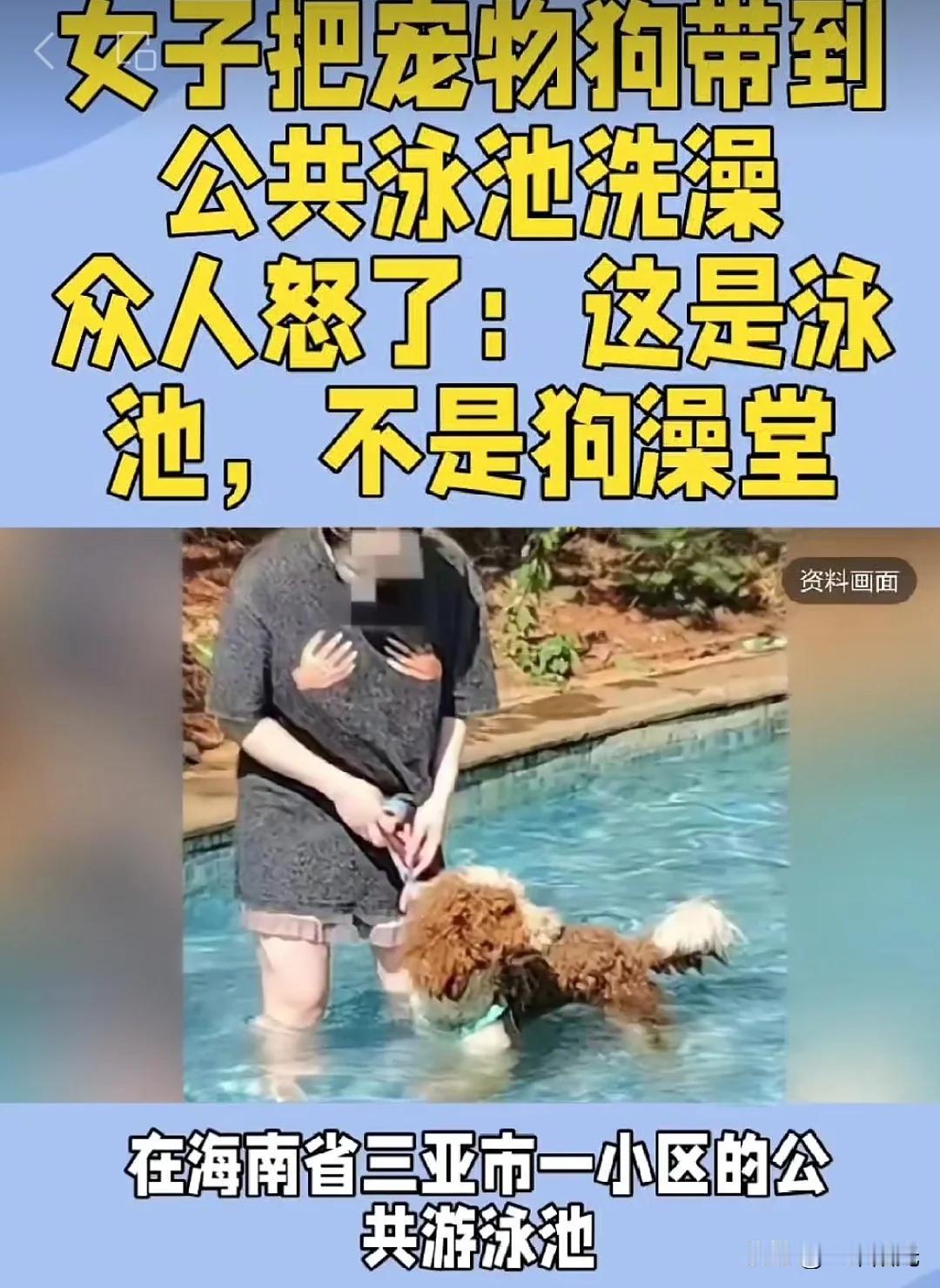 人高贵,狗也高贵。 三亚某小区,女子牵着狗进入泳池给狗洗澡。有不少孩子在泳池里戏水。岸边的业主纷纷谴责女子,但她依然故我,没有停止。目前,物业给水池换了水。 她就这么没有道德底线吗?其实狗不坏,坏的是养狗的人。这样的无德行为比狗还无知。 泳池应该换水,换水钱应该狗主人出。当时在泳池里游泳的人应该全面体检,若是游泳的人因为狗传染了疾病,狗主人应该负相应的责任。 谁摊上这样的邻居,真是倒霉。