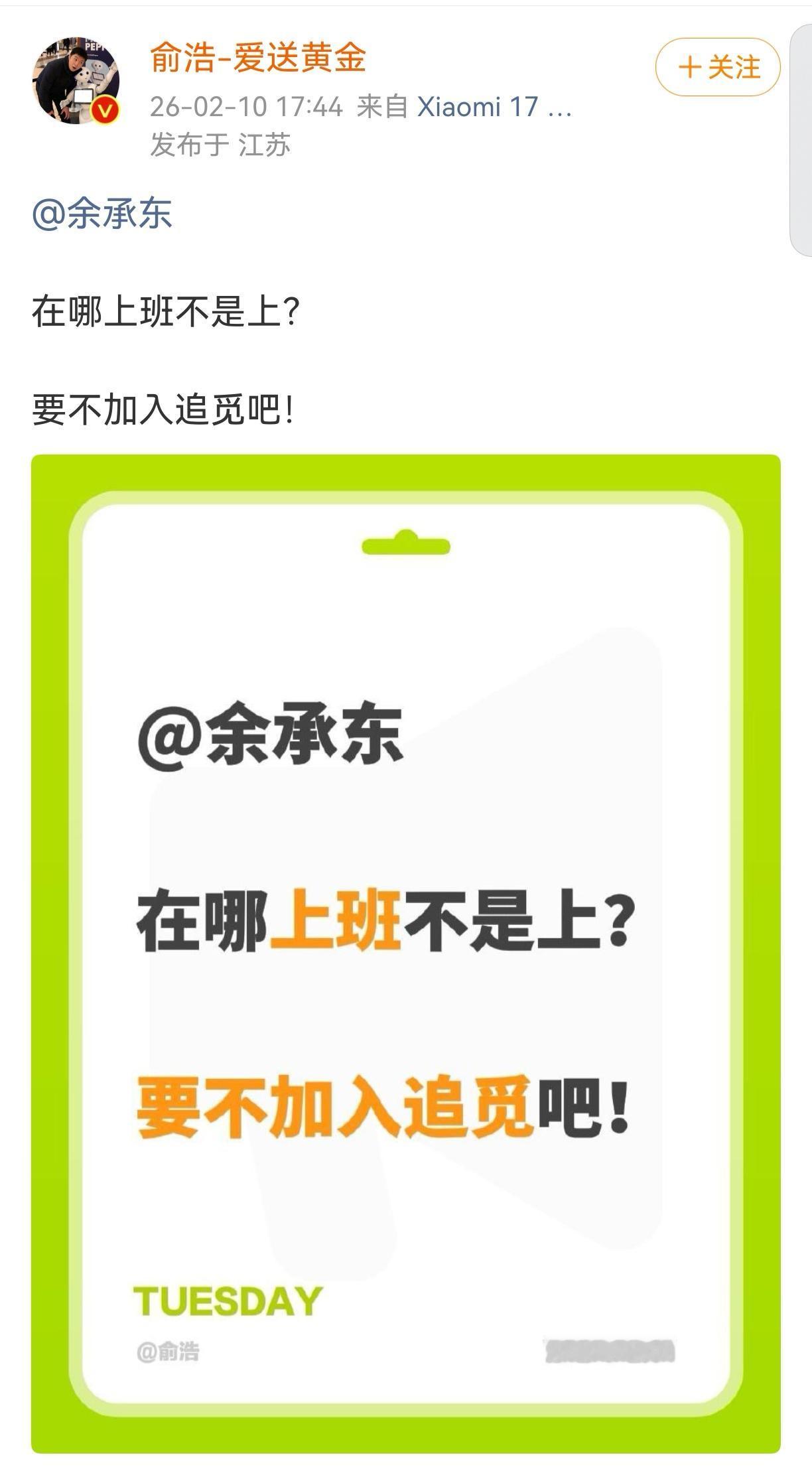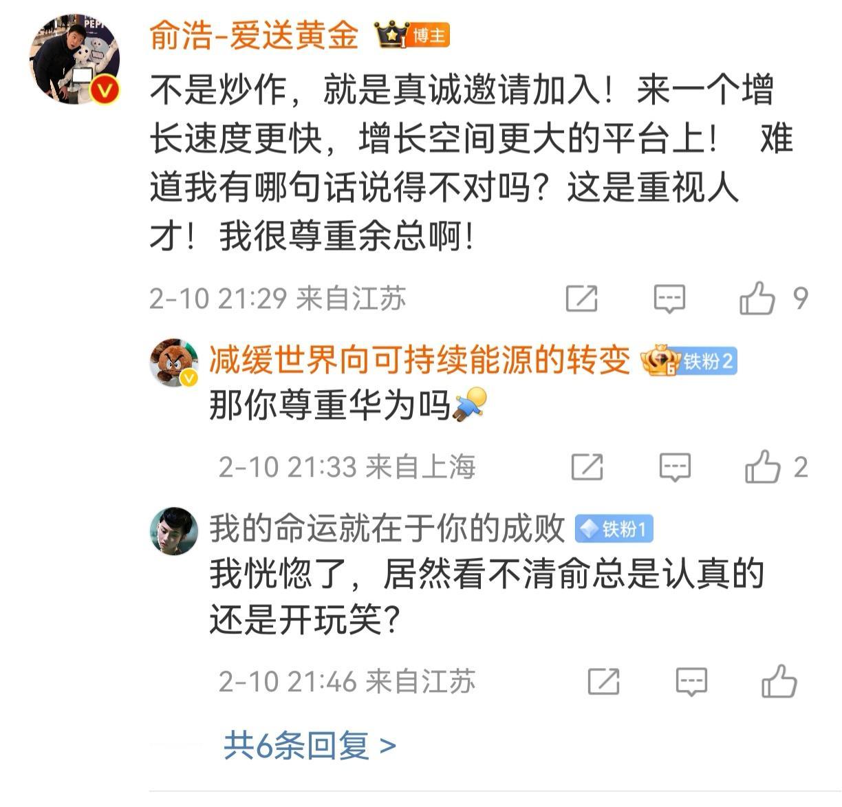 公开邀请余承东跳槽加入,“未来几年要成为世界首富”的追觅CEO俞浩,这是在努力抓住流量的风口浪尖啊! 俞浩今天在其WB上公开@余承东加入到追觅,并且说“做什么都可以”,而且跟网友互动时还提到:“真诚邀请加入!来一个增长速度更快,增长空间更大的平台”。 不知道他是有意还是无意,所谓的“更快”“更大”,肯定就是对比华为吧! 所有人都知道,余承东短时间内是不可能离开华为的,华为这样的平台,国内有可以比得过的吗? 与其说是公开邀约,我看也就是为了流量吧,毕竟,追觅的车要造势! 我好奇的是,余承东会回复他吗?追觅