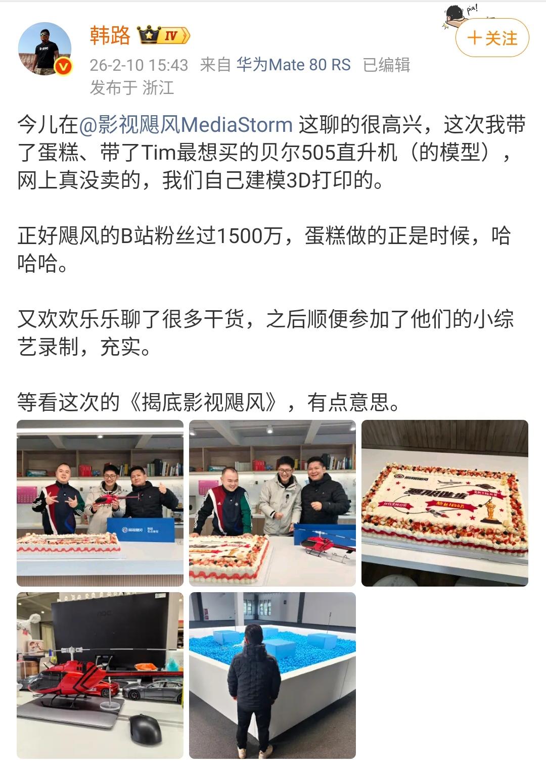韩路:今儿在影视飓风这聊的很高兴,这次我带了蛋糕、带了Tim最想买的贝尔505直升机(的模型)。 那很期待大老师这期视频,为大家带来怎样的幕后故事,其实车评就应该多方面的,作为行业比较头部的企业,更加多元的内容无疑是未来的方向。 影视飓风在多元化视频方面创作非常的成功,现在的粉丝增长速度也是超级的快。可能还是很多内容具有创新性,不单单是评测,样片日记等等。