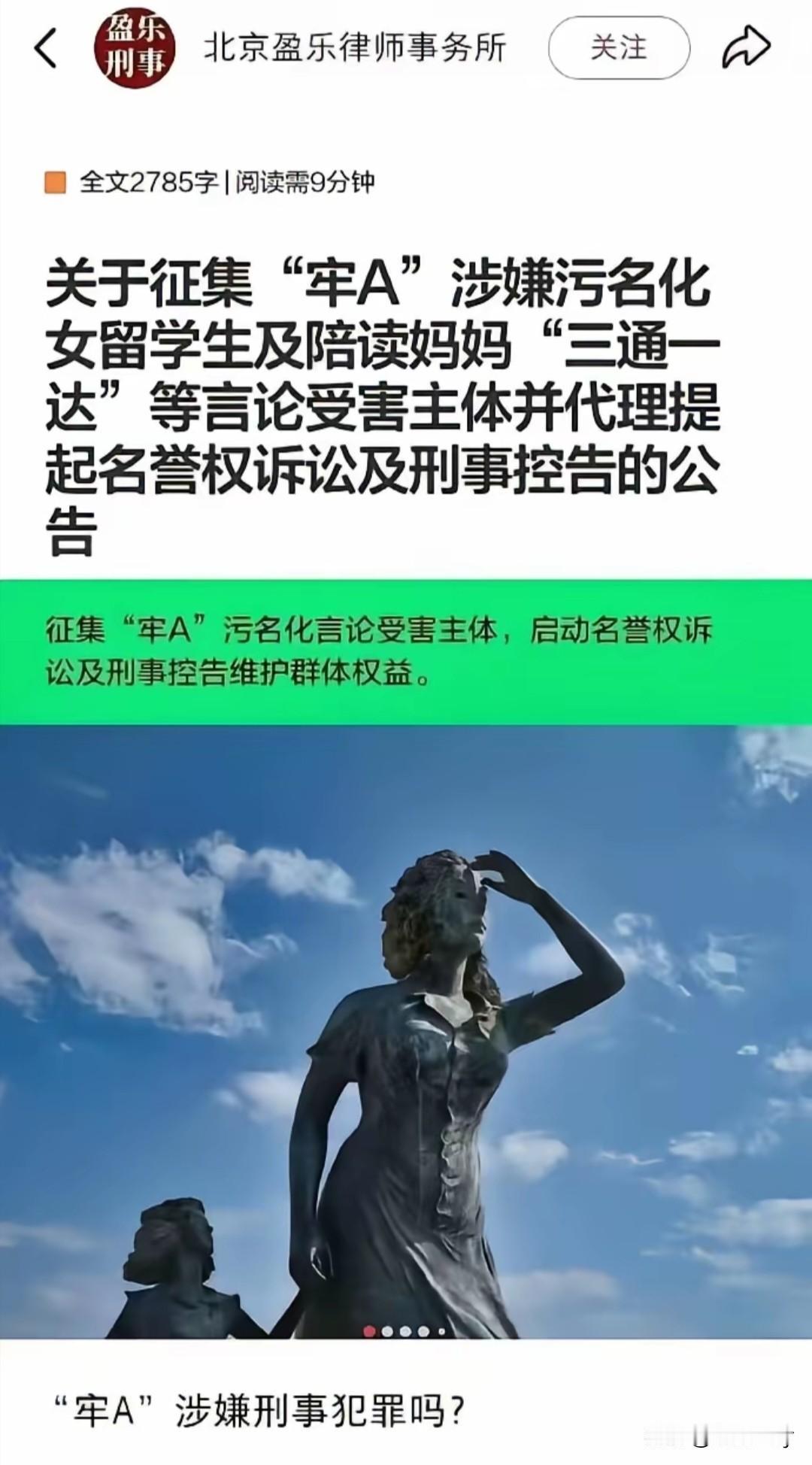 小律所搞大动作:刚开张就要全网征集,把劳a告到坐牢? 最近围攻网红牢A的阵仗又升级了。如果说之前的争议还停留在道德批判,现在有人直接把他“捅”到了法律层面。北京有一家律师事务所发布公告,说要公开征集“劳a污名化女留学生”的证据,不仅要让他赔钱,还扬言要追究刑事责任送他坐牢。 这架势,不知道的还以为是什么大律所。结果仔细一查,这家律所是去年9月才成立的,整个所公开信息显示只有3名执业律师,刚刚达到成立律所的最低人数门槛,纯纯的“草台班子”啊! 一个刚起步的“三人小作坊”,高调宣布要为一个庞大且模糊的“女留学生及陪读妈妈”群体代理一场全国瞩目的诉讼,这操作挺迷啊!这到底是真维权,还是蹭流量,亦或是因为某些话真的“戳到了某些人的肺管子”?