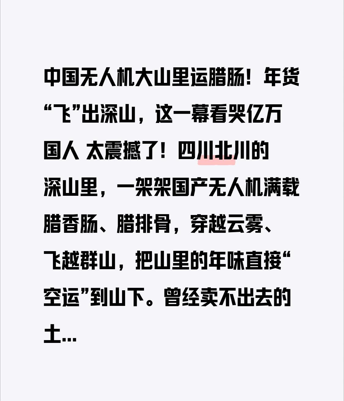 中国无人机大山里运腊肠!年货“飞”出深山,这一幕看哭亿万国人 太震撼了!四川北川的深山里,一架架国产无人机满载腊香肠、腊排骨,穿越云雾、飞越群山,把山里的年味直接“空运”到山下。曾经卖不出去的土年货,如今靠着科技翅膀,飞向全国餐桌,网友直呼:这才是中国乡村最动人的新年画面! 北川地处深山,山路崎岖、坡陡路滑,一到冬季还容易结冰封路。以前乡亲们灌好腊肠、晒好腊肉,只能靠老人孩子肩挑背扛,翻山越岭两三个小时才能运到山下,一趟最多背七八十斤,又累又危险,稍不注意就摔破筐、撒了货。好东西运不出去,只能低价卖,甚至烂在家里,看着就让人心疼。 谁也没想到,改变这一切的,竟是几架无人机!在外打工的村民返乡,带回了运载无人机,专门给老乡当“空中快递员”。一次能运120斤,20分钟直达山下,过去3个人干半天的活,现在一上午就搞定,效率翻了十几倍,腊肠完好无损、香味一点不跑。 本以为只是小众尝试,转折点来了:无人机不仅快,还更省钱!人力运1000斤要花600元,无人机只要200元,成本直降2/3。过去愁销路的土年货,如今新鲜直达、供不应求,订单从全国各地飞来,老乡们的收入直接翻番,过年的腰包更鼓、笑容更甜。 从“肩挑背扛”到“空中快运”,从“山货滞销”到“年货爆款”,一架小小的无人机,打通了山区物流的最后一公里,更托起了乡亲们的致富梦。这不是科幻大片,是发生在我们身边的真实乡村振兴;这不是高科技炫技,是实实在在帮老百姓过上好日子。 我们总说科技改变生活,最动人的改变,就是让深山不再遥远,让乡愁有处安放,让每一份辛苦都能换来回报。无人机运的不只是腊肠,是一家人的期盼,是一年到头的辛劳,是藏在烟火气里的中国年味。 天上飞的是无人机,地上奔的是好日子。愿更多科技走进大山,愿更多山货飞出深山,愿每一位勤劳的乡亲,都能靠双手和科技,过上富足、安心、幸福的新年! 为国产无人机点赞,为乡村振兴点赞,为每一个努力生活的中国人点赞!