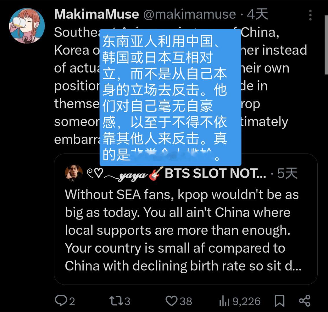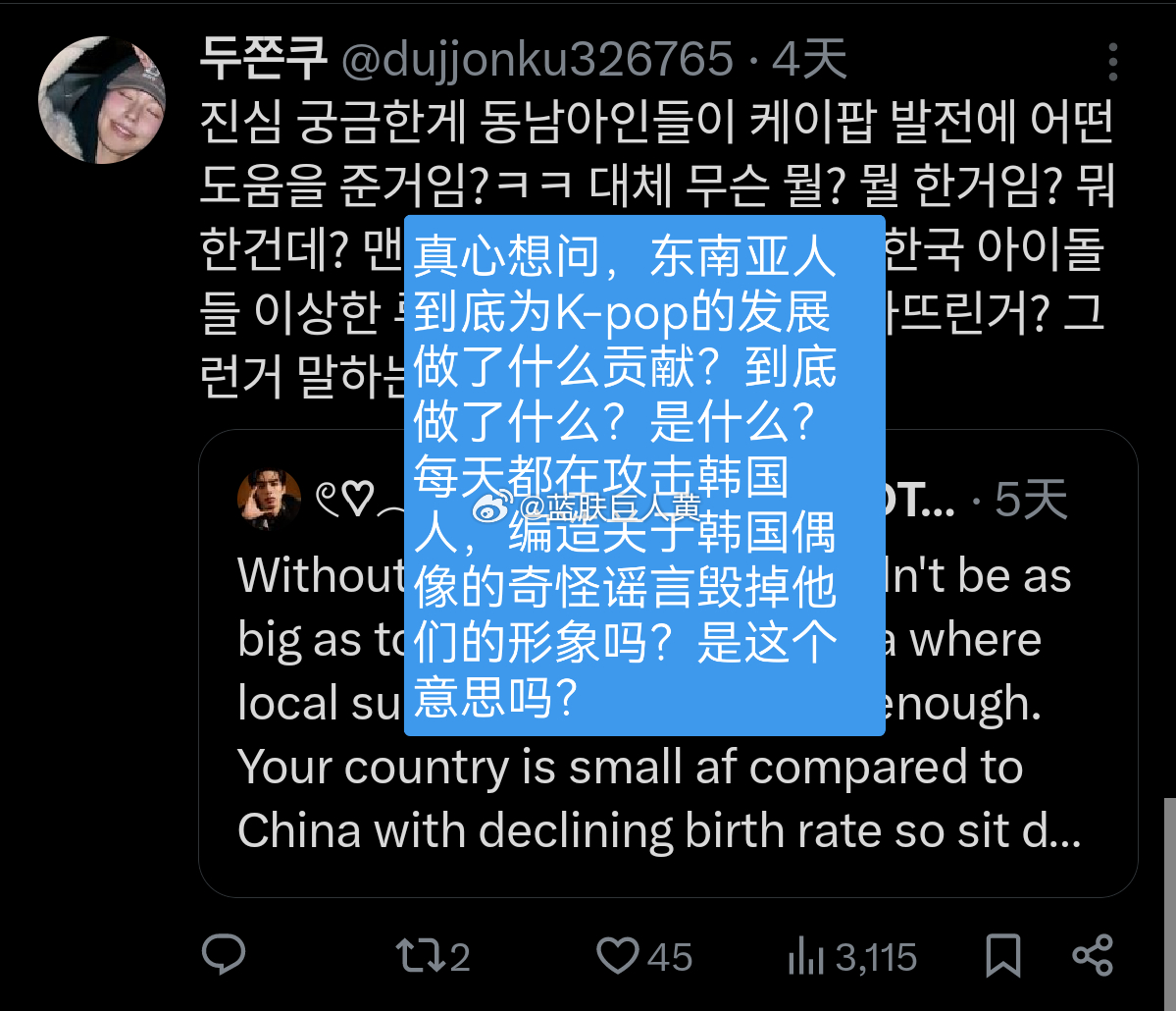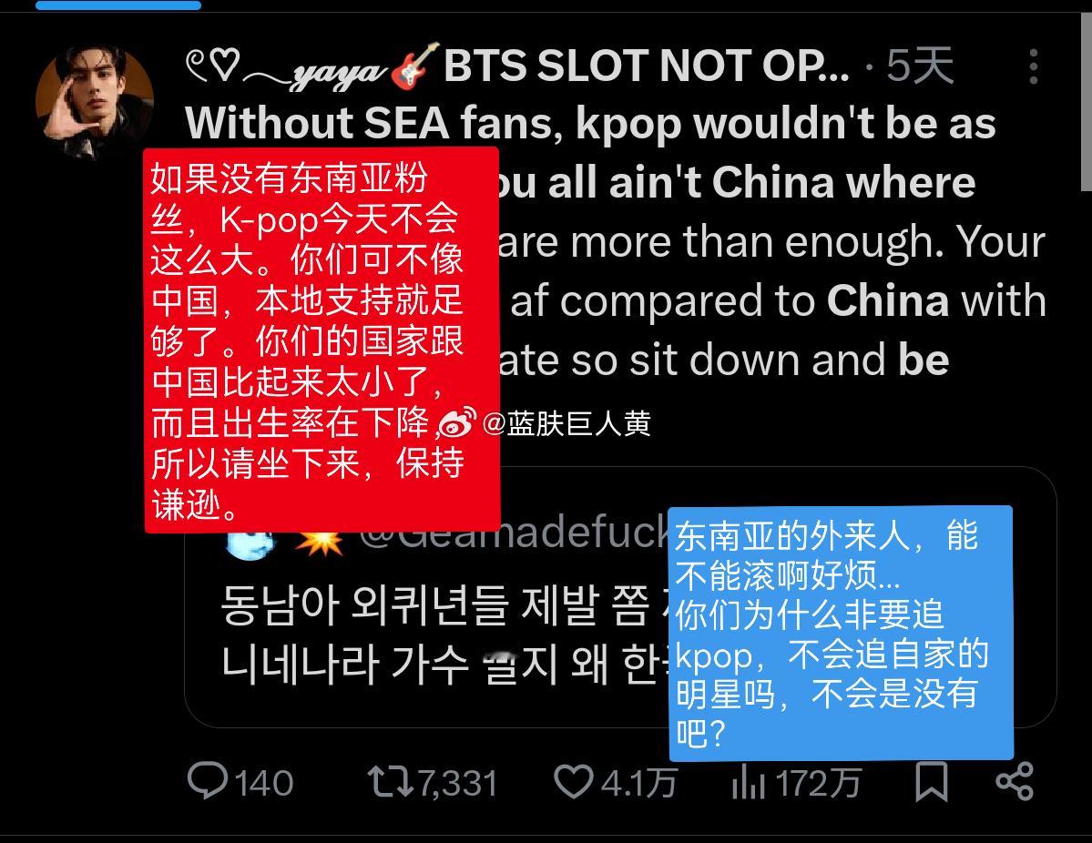 东南亚人把中国搬了出来“韩国跟中国比太小了,而且出生率在下降”韩国人对骂说“中国人追K-POP肯掏空口袋,而东南亚粉分币不掏, K-POP只在日本和中国赚钱”