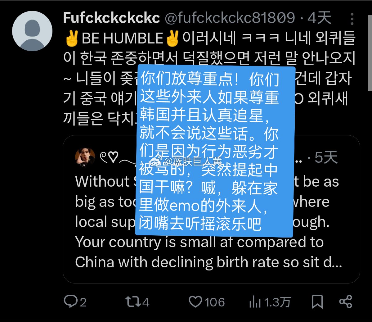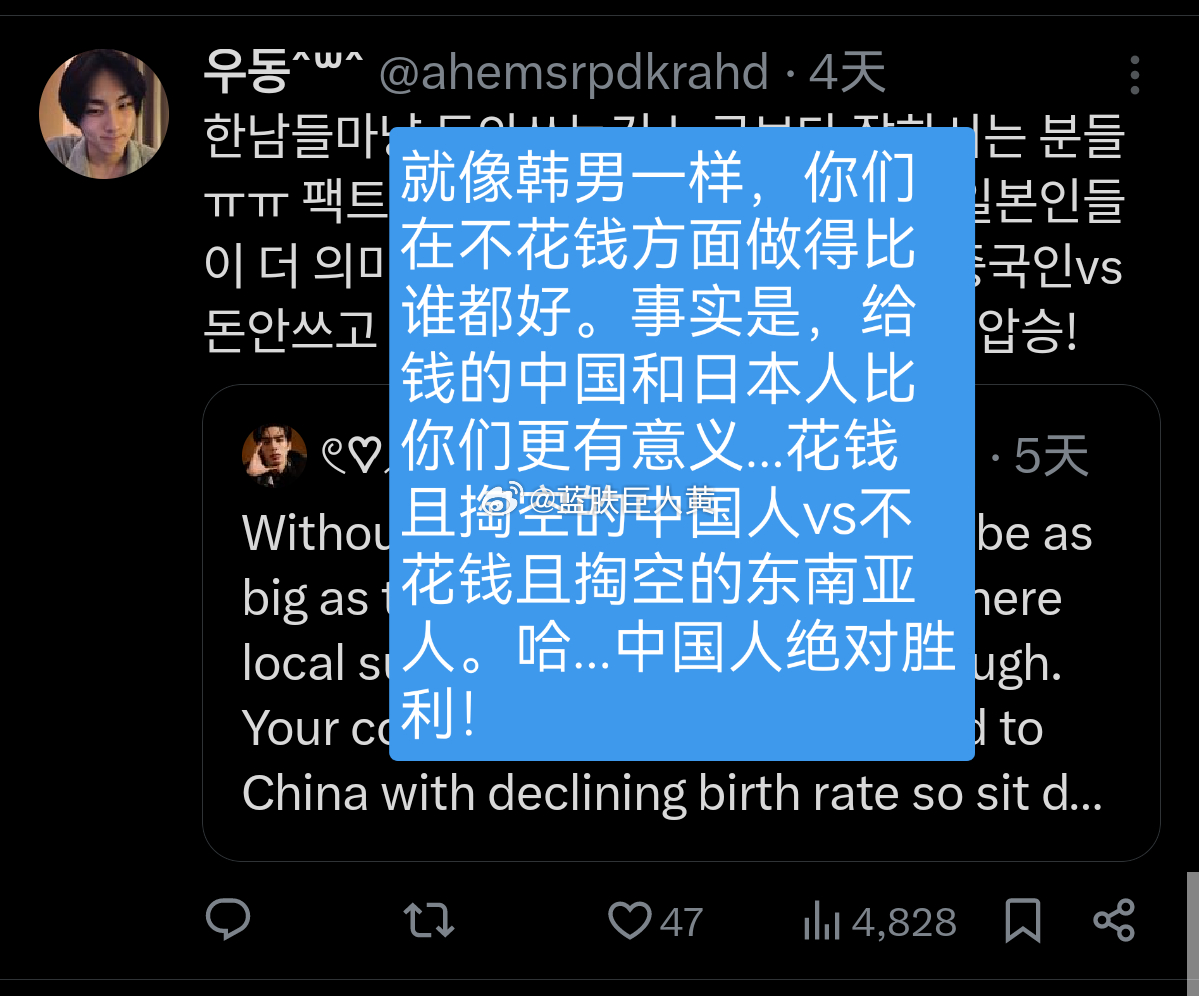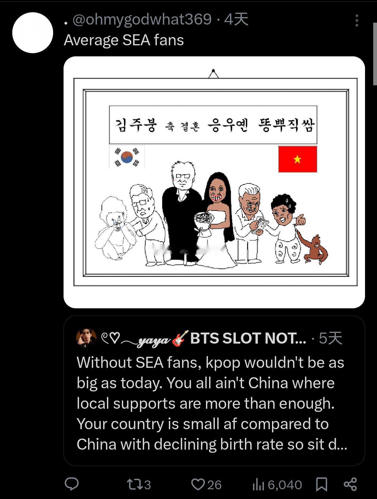 东南亚人把中国搬了出来“韩国跟中国比太小了,而且出生率在下降”韩国人对骂说“中国人追K-POP肯掏空口袋,而东南亚粉分币不掏, K-POP只在日本和中国赚钱”