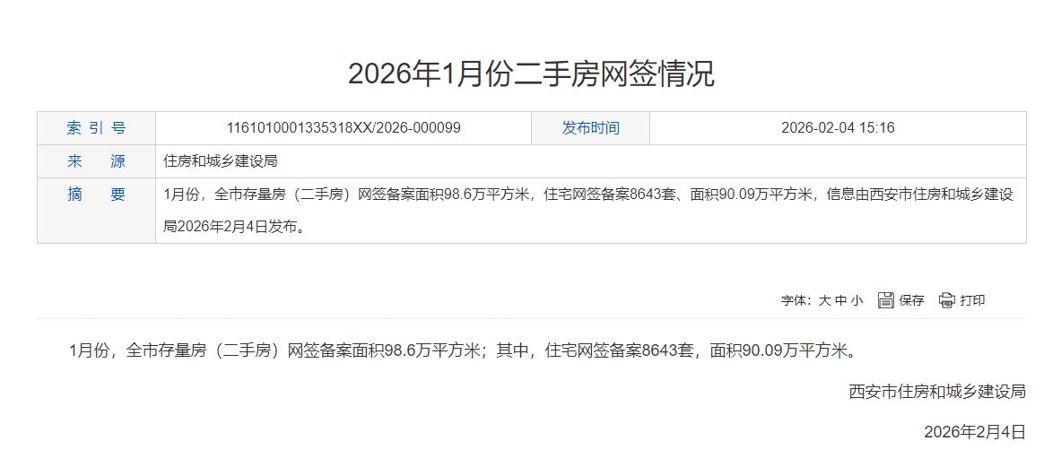 8643套!西安1月份二手房成交数据出炉... 近日,西安市住建局发布的《2026年1月份二手房网签情况》引发广泛关注。1月份,全市二手住宅网签备案达8643套,网签面积90.09万平方米。与2025年12月相比,网签套数环比上涨3.34%,市场热度持续攀升;与去年同期相比,更是同比大幅上涨42.91%,涨幅十分显著。 这一数据不仅创下自2023年至今1月份单月最高网签量,更是近半年来单月的峰值。 一般而言,每年1月受春节假期、天气寒冷等因素影响,楼市交易往往陷入低迷,进入传统淡季。但今年西安二手房市场却打破常规,走出独立行情。这背后,是城市发展带来的强大支撑。西安经济稳步增长,就业机会增多,吸引人口流入,住房需求持续释放。同时,楼市政策不断优化,降低了购房门槛,增强了购房者信心。 市场分化特征也愈发明显,核心区域凭借优质教育、医疗、商业等配套资源,二手房成交活跃、价格坚挺;而远郊区域去化压力较大,价格持续调整。 西安1月二手房市场的出色表现,为全年楼市发展开了个好头。相信在政策引导和市场需求的双重驱动下,西安二手房市场将继续保持健康稳定发展态势。