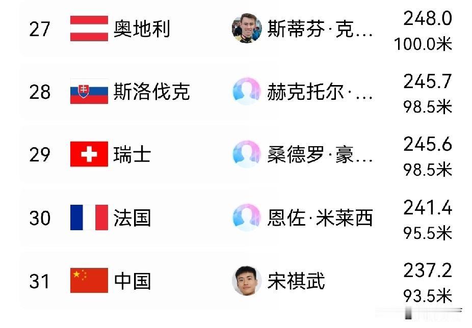 跳台滑雪男子个人标准台决赛:中国选手宋祺武获得第31名 冠军是德国选手274.1分,106.5米 宋祺武的成绩是237.2分,93.5米