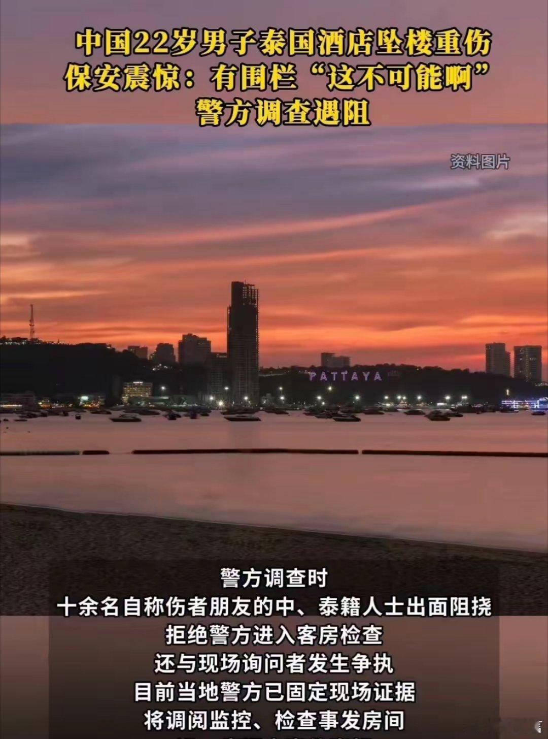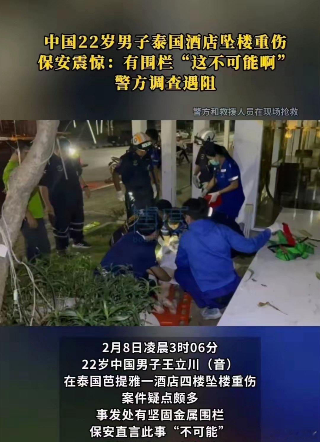 中国22岁男子泰国酒店坠楼重伤2月8日凌晨3时06分,泰国芭提雅一家酒店发生一起中国男子坠楼重伤事件,22岁男子王立川(音)从酒店四楼坠下,伤势危重。现场多处反常,引发广泛关注。事发后,救援人员紧急施救并将其送医。酒店保安表示,坠楼阳台装有封闭金属围栏,缝隙无法容纳成年人通过,正常情况下不可能发生坠楼,对此深感不解。更可疑的是,警方准备进入事发客房取证时,十余名自称伤者朋友的中泰籍人员突然出现,拒绝警方入内,禁止现场拍摄,并与工作人员发生争执,后经保安制止才散去。此举与正常亲友期盼查明真相的态度截然相反,疑似意图破坏现场痕迹。目前,泰国警方已固定现场证据,将调取监控、勘查房间,进一步调查事件原因。在此提醒出境中国公民,在外注意人身安全,遇紧急情况第一时间联系中国驻当地使领馆,保留证据,远离可疑人员与环境,确保自身安全。