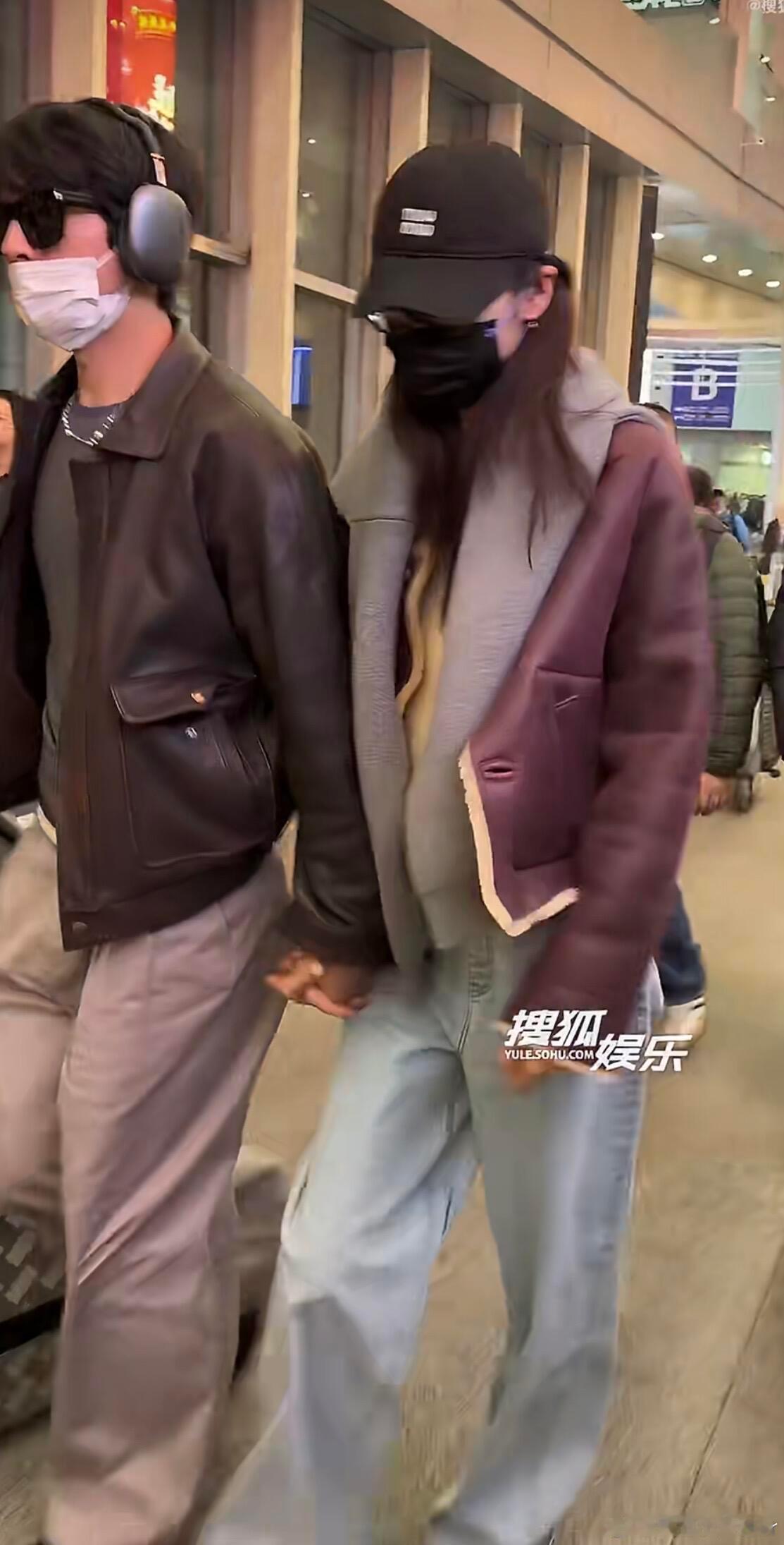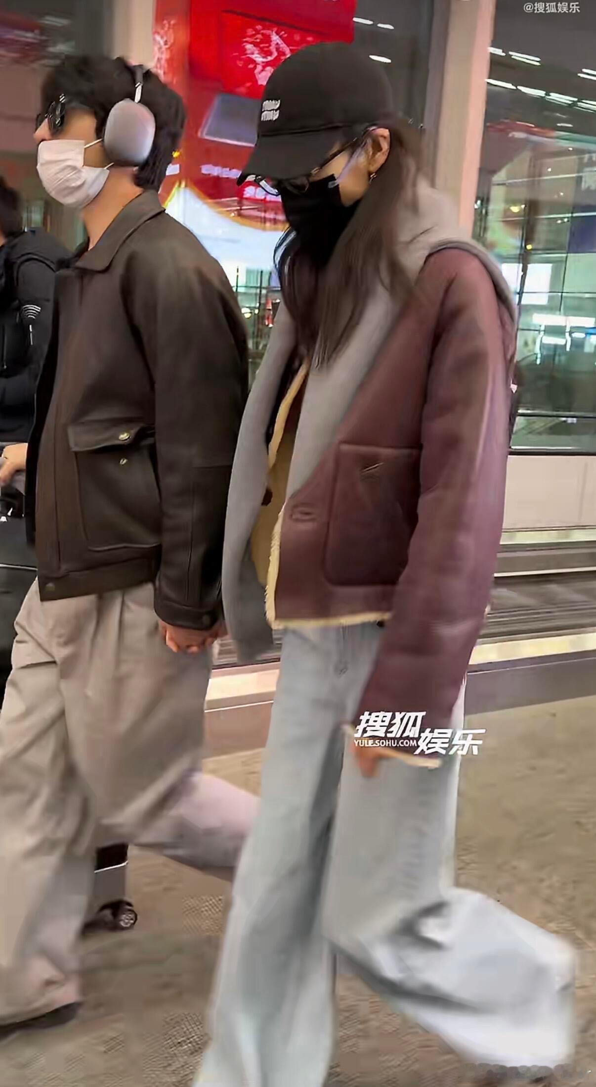 井柏然刘雯机场十指紧扣情侣穿搭范本📖刘雯井柏然回京的机场穿搭手牵手走路带风同色系穿搭超级养眼