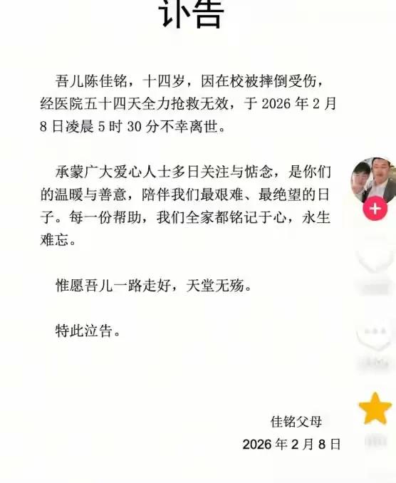 可怜的孩子陈佳铭还是离世了。他的爸爸发了讣告。令人心痛啊!校园内被同学打闹,昏迷50多天,于2月8日凌晨五时30分不幸离世。陈佳铭的事一直令我们很揪心,大家一直都在关注。他的爸爸妈妈一次一次坚守不愿意放弃。原本以为奇迹会出现,没想到今天听到这个不幸的消息。