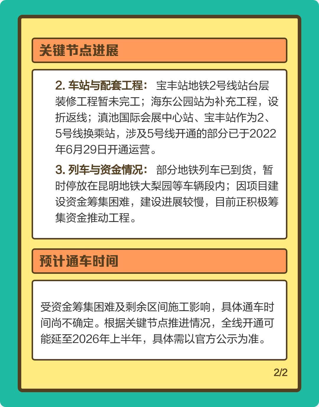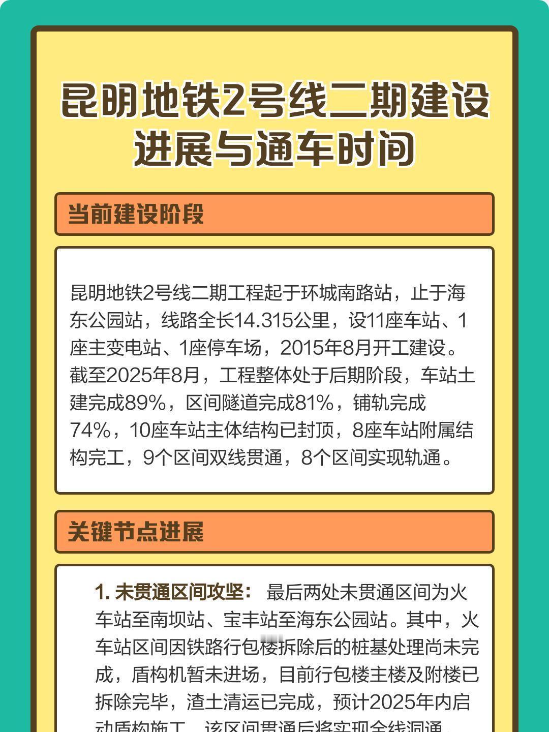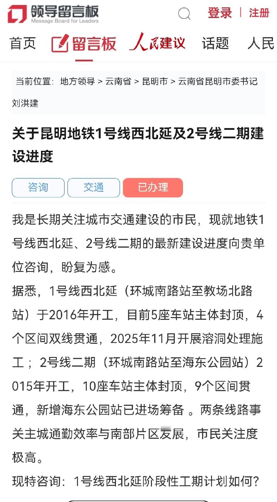 【昆明网民关注昆明地铁1号线西北延及2号线二期建设进度如何?】 ✍📩昆明网民在领导留言板给昆明市委书记留言咨询: 🚄🚆关于昆明地铁1号线西北延及2号线二期建设进度 我是长期关注城市交通建设的市民,现就地铁1号线西北延、2号线二期的最新建设进度向贵单位咨询,盼复为感。 据悉,1号线西北延(环城南路站至教场北路站)于2016年开工,目前5座车站主体封顶,4个区间双线贯通,2025年11月开展溶洞处理施工 ;2号线二期(环城南路站至海东公园站)2015年开工,10座车站主体封顶,9个区间贯通,新增海东公园站已进场筹备 。两条线路事关主城通勤效率与南部片区发展,市民关注度极高。 现特咨询:1号线西北延阶段性工期计划如何?教场北路站还建工程何时完工?2号线二期昆明火车站至南坝站区间盾构施工何时启动?两条线路是否有初步通车预期?恳请贵单位公开最新进展及难点攻坚措施,方便市民合理规划出行。 📢📢📢 2026-02-09 19:00昆明市交通运输局官方回复→ 网民同志:您好! 您通过人民网领导留言板的留言收悉,经昆明市交通运输局调查处理,现将有关情况回复如下: 🚈🚝目前,轨道交通1号线西北延、2号线二期正在积极推进。其中,教场北路站涉及的拆除还建工作正在按计划开展。 下一步,昆明市交通运输局将督促指导昆明轨道集团积极筹划开展剩余工程建设的有关工作,争取早日完成1号线西北延、2号线二期建设任务,实现线路开通运营,具体开通时间以公示为准。 感谢您的理解与支持,顺祝身体健康、生活愉快!