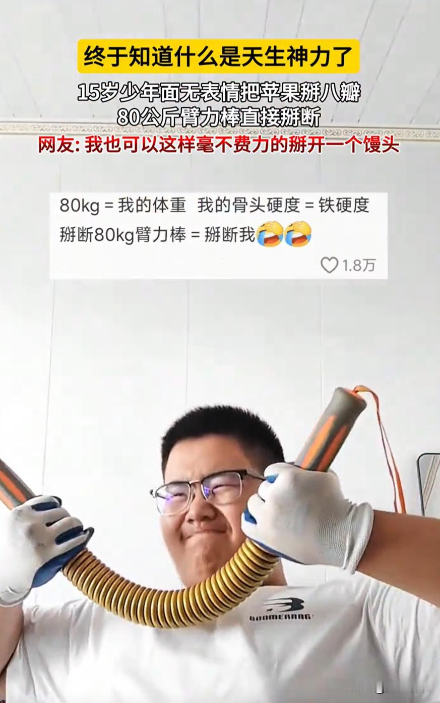 “现代版李元霸!”辽宁,一名15岁男孩火了,年纪不大却拥有天生的神力,不仅能轻轻松松把一个苹果掰成八瓣,甚至还将80公斤的臂力棒直接掰断,网友:以前看古代那种1打10,打20的人我以为是吹牛,现在具像化了 他既不是专业的健身选手,也没有接受过系统的力量训练,就是个普通的15岁少年,可发力的瞬间,却有着远超成年人的爆发力。 刷到他的视频,第一眼还觉得平平无奇,少年手里攥着个新鲜的红苹果,看着跟咱们平时准备吃的没两样。 可下一秒,他没借助任何工具,手指轻轻一扣一发力,苹果“咔嚓”一声就被干脆利落地掰开,动作流畅得不像样。 这还不算完,紧接着他又顺势发力,几下下来,一个完整的苹果,居然被均匀地掰成了八瓣,每一块大小都差不多。 很多网友看完都调侃,这苹果怕不是纸做的?但镜头拉近就能看到,果肉的纹理、渗出的果汁都清清楚楚,绝对是实打实的真苹果。 可能有人会说,掰苹果不算啥,力气大点儿的人都能做到,可接下来的操作,才是真的把全网看傻了,也让大家真正见识到,什么叫天生神力。 少年从一旁拿出一根臂力棒,上面明明白白标注着80公斤,懂行的人都知道,这可不是普通新手能驾驭的器材。 咱们先说说这80公斤臂力棒到底有多难操控,平时咱们在健身房见到的,大多是30到50公斤的,就算是经常健身的壮汉,双手握着发力,也只能勉强弯动几下。 更别说掰断了,很多成年人双手握两端,拼尽全力也只能让它弯出一个小小的弧度,想要掰断,几乎是不可能的事。 可这个15岁的少年,却做出了让人难以置信的举动。他没有像普通人那样双手握两端,而是单手直接抓住了臂力棒的正中间。 懂点杠杆原理的都清楚,这个位置是最难发力的地方,需要的力量,比握两端要大上一倍不止,相当于要单手对抗远超80公斤的阻力。 只见他神色淡然,没有丝毫费力的样子,手臂轻轻一紧,那根钢制的臂力棒,瞬间就被弯成了一个夸张的U形。 紧接着,“啪”的一声脆响,臂力棒居然从中间直接断裂,断口整齐利落,整个过程一气呵成,连一秒钟都不到。 说实话,看完这段视频,我反复回放了好几遍,还是不敢相信自己的眼睛,一个15岁的少年,怎么会有这么惊人的力量。 后来了解到,少年平时和普通中学生没两样,上课、写作业、偶尔和同学一起运动,从来没有刻意练过力量,这份神力,就是天生的。 有人猜测,这可能和他的肌肉纤维类型有关,天生爆发力强的人,肌肉效率比普通人高很多,再加上遗传因素,才造就了这份异于常人的力量。 不过也有不少人担心,青少年骨骼还没完全发育成熟,这么大的力量发力,会不会对关节和骨骼造成损伤,影响后续的生长发育。 其实这种担心也有道理,毕竟15岁正是生长发育的关键期,就算天生神力,也得注意保护自己,不能盲目发力展示。 以前咱们看史书,总看到古人描写“力能扛鼎”“万夫不当之勇”,总觉得是古人夸张了,毕竟咱们平时见到的,都是普通人的力量上限。 可看完这个少年的操作,突然就懂了,人类的身体潜能,可能真的远比我们想象中要强大,古人的那些记载,或许真的不是夸张。 这个辽宁少年,凭着这份天生的神力走红,没有炫耀,没有炒作,全程都很淡然,这份沉稳,比他的力量更让人佩服。 很多网友都说,这就是现实版的李元霸,年纪轻轻就有如此神力,未来要是能好好引导,把这份天赋用在合适的地方,肯定大有可为。 毕竟天生神力可不是每个人都有的,要是能加以科学的训练,兼顾保护身体,说不定将来能在体育领域闯出一片天地。