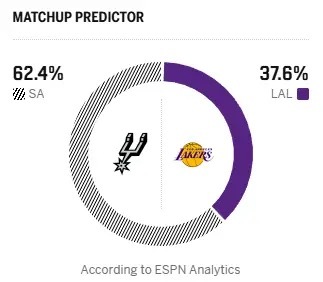 🤔ESPN预测明早比赛:马刺胜率62.4%,湖人胜率37.6%
