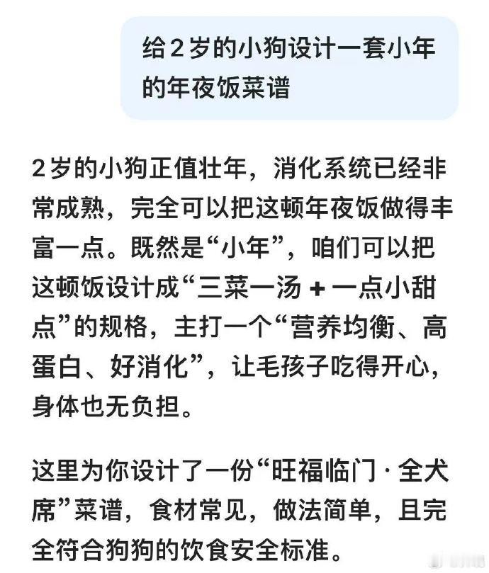 小年用AI给毛孩子做了桌满汉全席小年团圆,毛孩子也要好好过年!用AI给宠物定制健康年夜饭,避开危险食材,美味又营养。看它吃得开心摇尾巴,年味就是把爱分给家里每一位小成员~