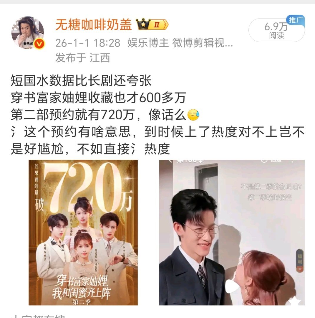 现在短国注水注得也是超级离谱穿书妯娌3刚上没一个小时就收藏30万,首集评论5.7万,2上了10天收藏才300万首集评论4万多这速度比太奶3都厉害得多明天热度不得最少2亿 这公司财大气粗,之前预约量就注海 网页链接 我还说不如直接氵热度,还真氵啊