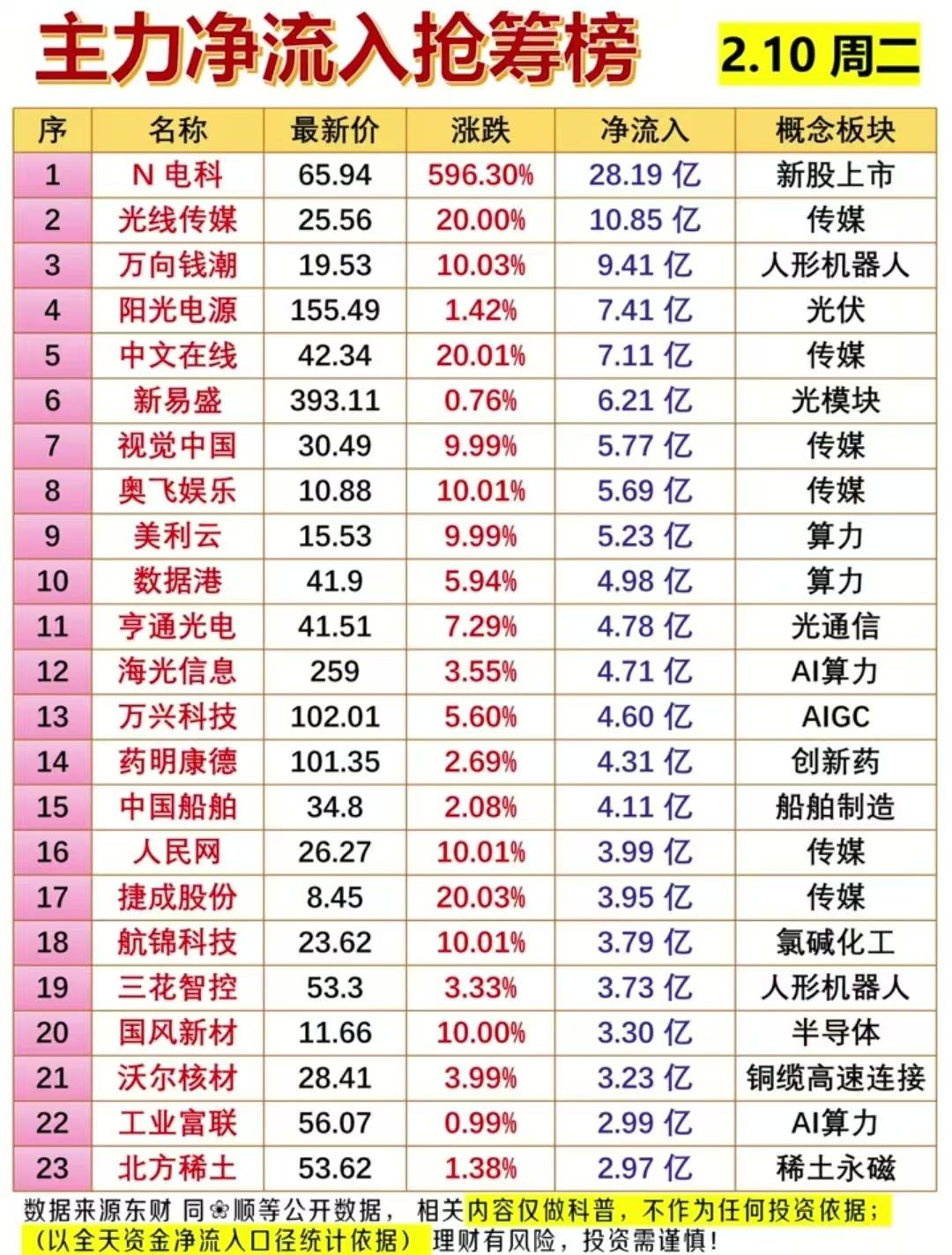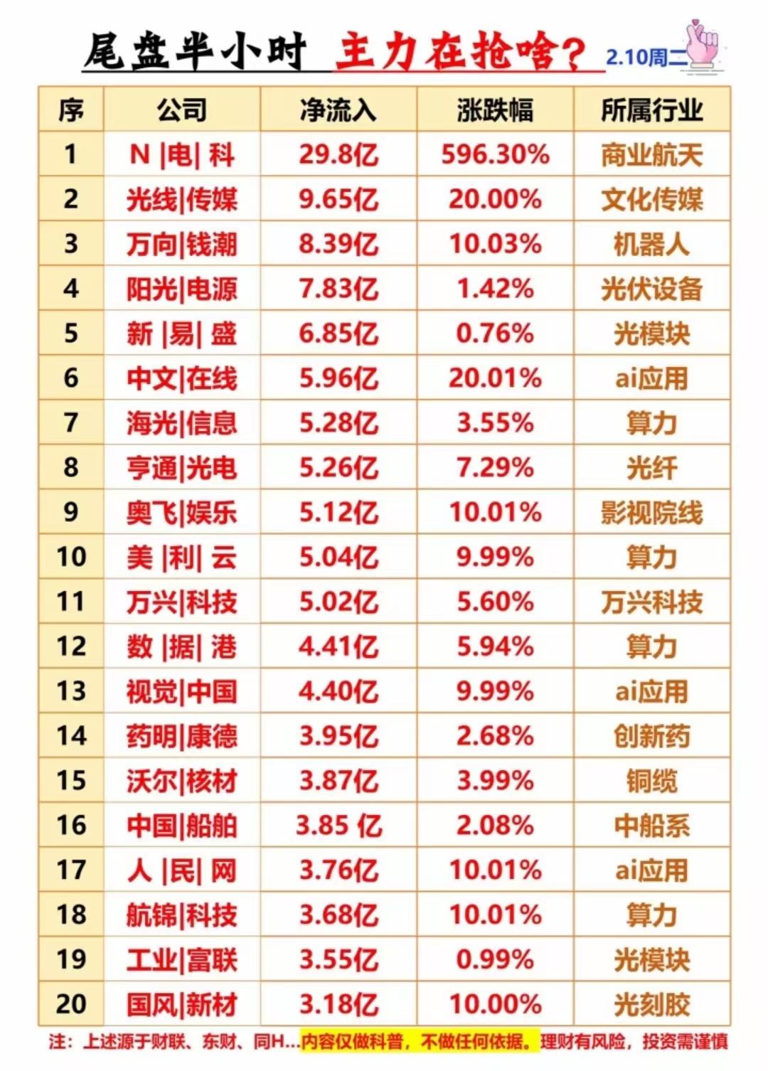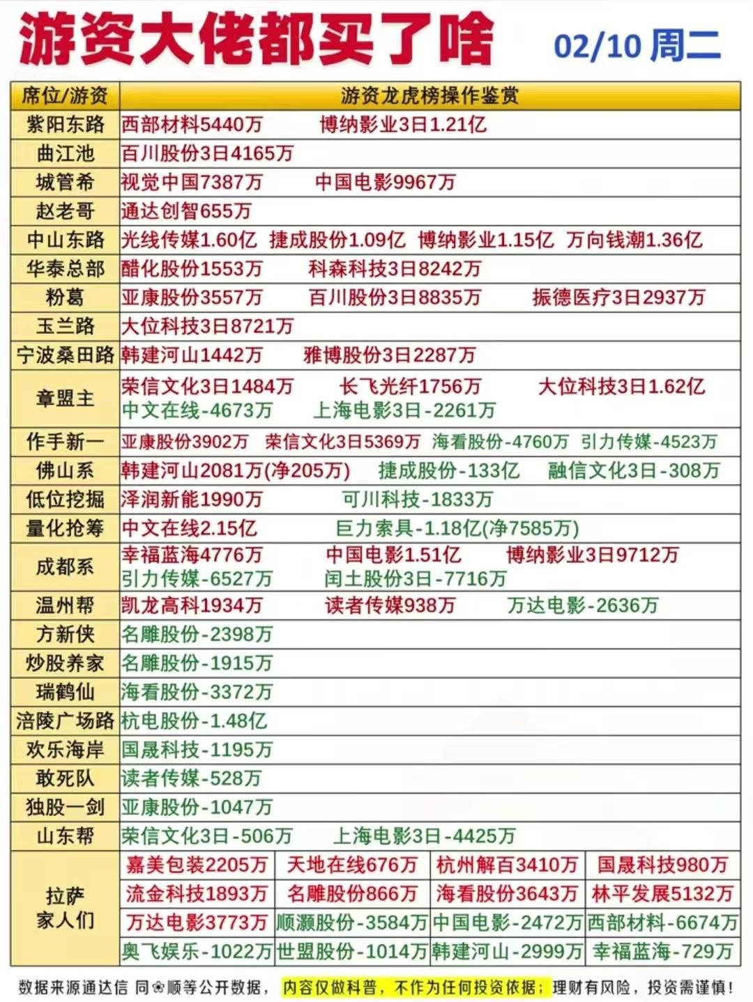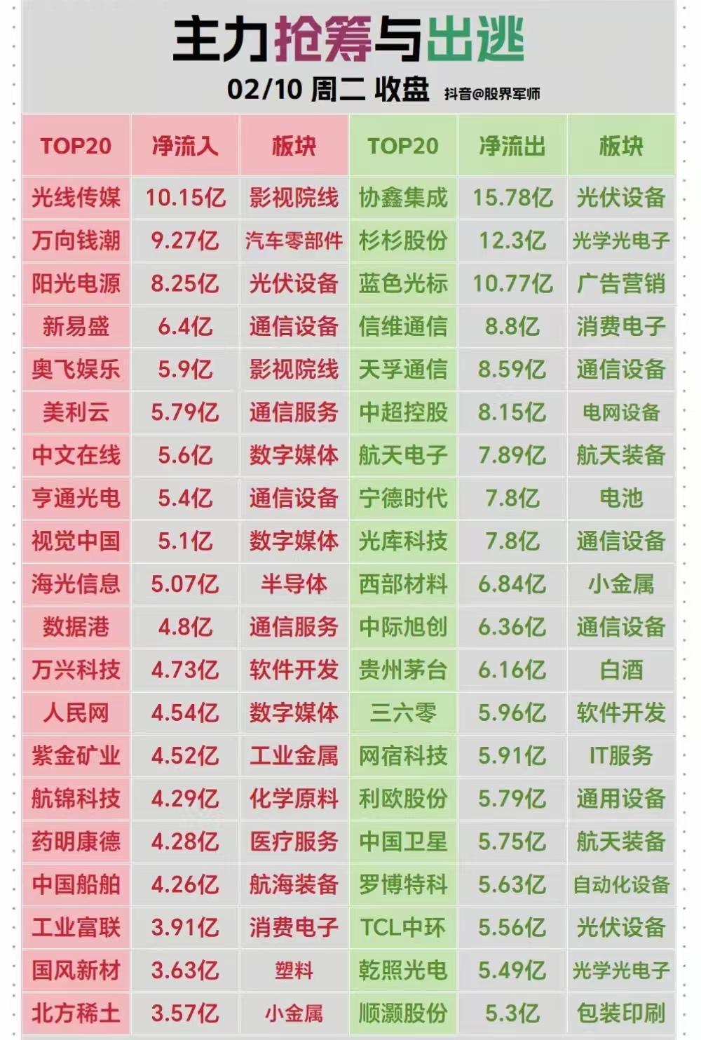 2月10日复盘整理! A股全天窄幅震荡,三大指数涨跌不一,科创50涨近1%,两市成交额2.11万亿,较前一交易日缩量1439亿。 传媒板块:全天领涨,万达电影、读客文化、捷成股份、荣信文化、横店影视、上海电影、博纳影业、中国电影、光线传媒等多股涨停。 游资动向:中山东路狂买光线传媒1.60亿、捷成股份1.09亿、博纳影业1.15亿;章盟主、成都系、城管希等大佬集体加仓中国电影、博纳影业、荣信文化等核心标的,人形机器人龙头万向钱潮获中山东路1.36亿扫货。 主力抢筹:光线传媒、中文在线、视觉中国等传媒股霸榜,主力净流入超10亿!2026影视传媒元年,八大细分赛道龙头名单曝光!从影视院线、短剧爆发,到文生视频、数字确权,每一条赛道都暗藏翻倍机会。这份“太子+二哥”梯队名单,帮你精准锁定核心标的,提前布局下一轮行情。(详细名单见图五) 本文内容仅为信息分享,不构成任何投资建议。市场有风险,投资需谨慎。个人观点不代表未来收益承诺,据此操作盈亏自负。