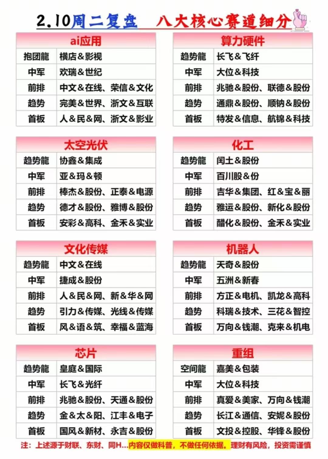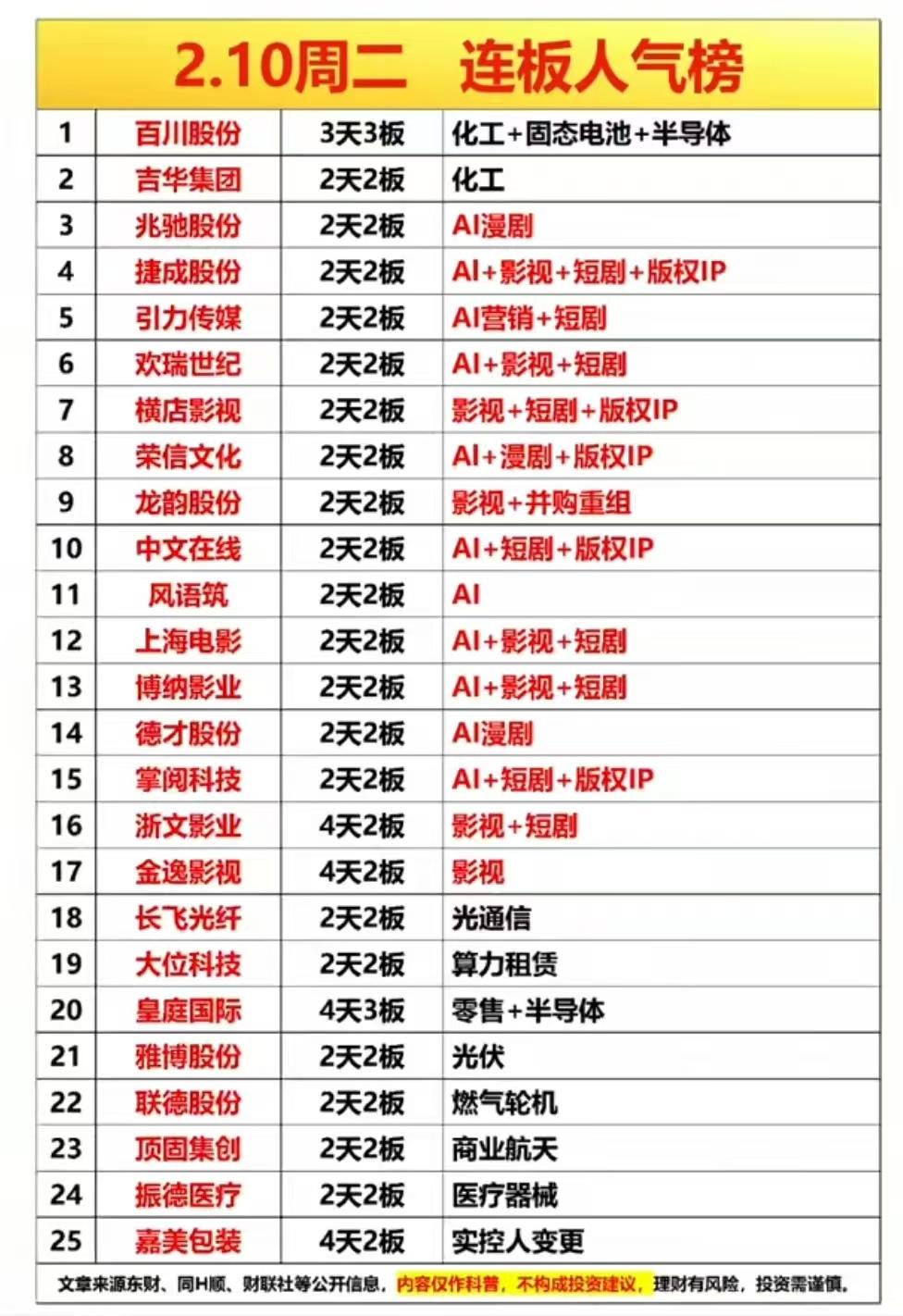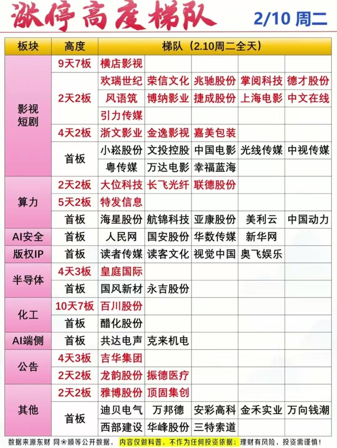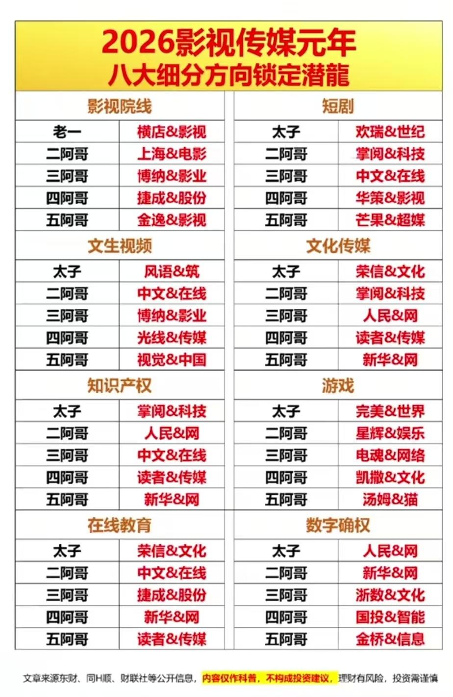 2月10日复盘整理! A股全天窄幅震荡,三大指数涨跌不一,科创50涨近1%,两市成交额2.11万亿,较前一交易日缩量1439亿。 传媒板块:全天领涨,万达电影、读客文化、捷成股份、荣信文化、横店影视、上海电影、博纳影业、中国电影、光线传媒等多股涨停。 游资动向:中山东路狂买光线传媒1.60亿、捷成股份1.09亿、博纳影业1.15亿;章盟主、成都系、城管希等大佬集体加仓中国电影、博纳影业、荣信文化等核心标的,人形机器人龙头万向钱潮获中山东路1.36亿扫货。 主力抢筹:光线传媒、中文在线、视觉中国等传媒股霸榜,主力净流入超10亿!2026影视传媒元年,八大细分赛道龙头名单曝光!从影视院线、短剧爆发,到文生视频、数字确权,每一条赛道都暗藏翻倍机会。这份“太子+二哥”梯队名单,帮你精准锁定核心标的,提前布局下一轮行情。(详细名单见图五) 本文内容仅为信息分享,不构成任何投资建议。市场有风险,投资需谨慎。个人观点不代表未来收益承诺,据此操作盈亏自负。