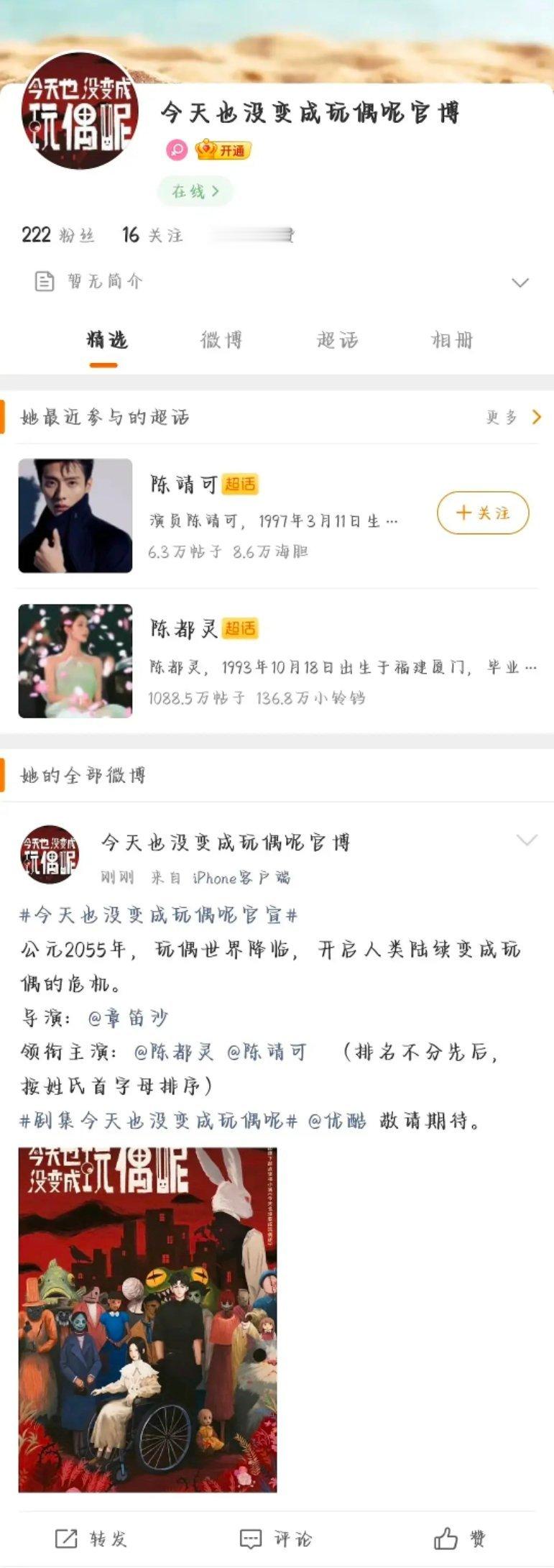 陈都灵新剧《今天也没变成玩偶呢》官博名字被人恶意占据,导致剧组开通官博后还是一串