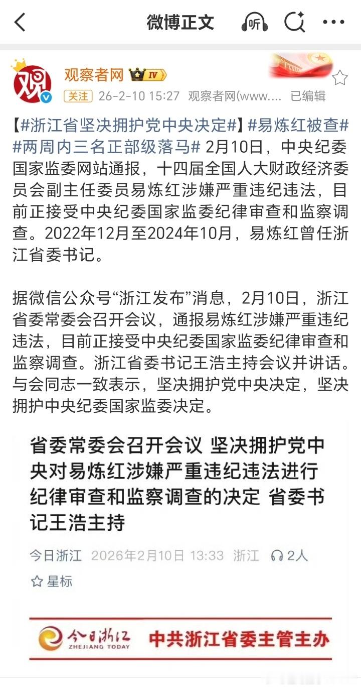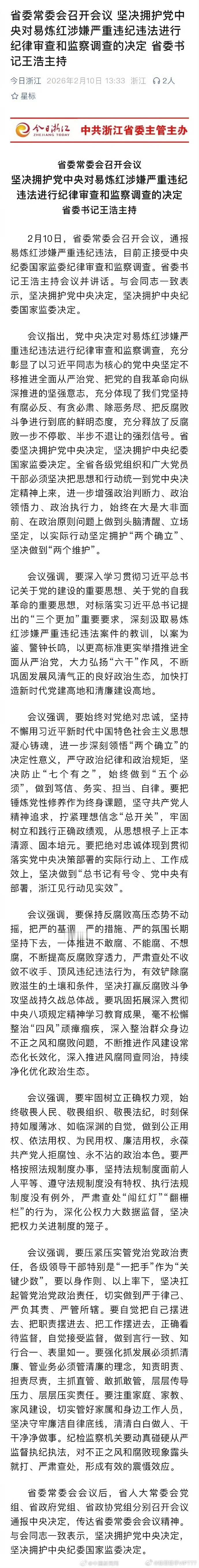 据微信公众号“浙江发布”消息,2月10日,浙江省委常委会召开会议,通报易炼红涉嫌严重违纪违法,目前正接受中央纪委国家监委纪律审查和监察调查。