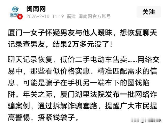 福建厦门,一女子深夜总是看到男友跟别的女子聊信息,就怀疑男友是不是在跟其他人搞暧昧。女子一直想要查看到男友的聊天记录,就找到一位专业人员,据说可以恢复手机里的信息,但是要缴纳保证金,才能执行恢复数据的操作。谁知道,这位专业人员一直说数据延迟,一直就让女子缴费,前后一共缴纳了23700多元,聊天记录也没有查到。女子这才醒悟,对方就是个骗子。 据闽南网报道称,女子感觉被骗之后,立刻就报了警,钱财也被骗了,男友这边可能还背叛了自己的感情,女子感到非常郁闷。 很多恋爱中的女子,智商都非常高,有的时候跟踪起自己的男友,可以说是堪比破案神人,男友见了谁、跟谁聊了天,都能被女友给查询出来。 刘女士(化名)就是这样的女子,恋爱之后,时不时的也会患得患失,总是感觉男友似乎外面有人。 有一天晚上,时至深夜,刘女士看到男友还没睡觉,还在刷着社交软件,刘女士看到,自己的男友在一个对话框里聊天。 对方很明显就是一个女生的头像,男友聊的非常深入,脸上还带着微笑,沉浸式相聊,丝毫就没有留意到旁边的刘女士正在注意自己的一举一动。 很明显,男朋友就是在跟别的女子搞暧昧,但是如果想要看到具体的聊天内容,则要拿到他的手机才行。 然而,男友也很谨慎,每次聊完之后,都会将信息全都清空。 这个时候刘女士才知道,即便拿到男友的手机,也完全看到他之前聊天的内容。因为找不到实实在在的证据,刘女士内心疑心病十分严重,整天也睡不好,又不甘心,但是实在好奇不知道他们到底聊了什么。 有一天,刘女士在网上看到了一个推荐,对方可以快速将删除的聊天记录数据全都恢复。 当时,刘女士就跟这个男子互相加为好友,然后请教,应该怎么恢复聊天数据。 对方男子麦某表现的很专业,分析了很多专业的数据细节。并且还表示,只要支付保证金,一定可以立刻就把数据恢复出来。 刘女士很急切,迫切的要知道男友究竟跟对方女子谈了什么内容,想都没想,立刻就给对方转账了。 可是谁知道,麦某都是深夜给刘女士发信息,等到第二天刘女士醒来的时候,才看到麦某的信息,再回复的时候,对方就说刘女士信息延误了。 没办法,昨晚的操作,对方声称作废,还要刘女士继续缴纳保保证金。 刘女士就这样,一笔一笔的给麦某转钱,麦某则表示,等到数据恢复之后,之前的几笔保证金,之后都会一次性返还给刘女士。 然而,刘女士并没有看到实际的效果,所谓的聊天记录,仍然没有被破解出来。 而到了这个时候,刘女士一共支付了23700多元给了对方,麦某还是在找理由,估计他根本就解密不了。 直到再次索要保证金,刘女士这才发现,她从头到尾都被对方给欺骗了,立刻就拿起手机报了警。 如今,这起诈骗案还在处理中,需要等到抓捕到麦某之后,才可以上诉追偿。 1.男子故意欺骗女子,声称可以破解聊天记录,前后一共骗走将近24000元。对于男子的行为该如何评价? 根据《刑法》第二百六十六条规定,以非法占有为目的、虚构能破解聊天记录等事实,让女子产生错误信任并且基于此错误认为可以处分财产,符合诈骗罪的构成要件。 男子诈骗靠近24000元,已经达到了刑事立案标准,属于“数额较大”,将会面临三年以下有期徒刑、拘役或者管制,并且还要单处罚金。 2.如果女子悄悄破解了男友的聊天记录,她偷看男友聊天记录的行为,应该如何判定呢? 根据《民典法》第1032条规定,自然人享要隐私权,任何组织或者个人不得刺探、泄露、公开他人隐私。聊天记录属于典型的“私密信息”,即便是亲密恋人,也无权擅自查阅。 当查阅他人的隐私信息,行为虽然不构成犯罪,但是可能需要承担法律责任,被侵权方还可以主张各项损失赔偿,包括精神损害费用。 对于刘女士来说,她的初衷是查清楚真相,要么是维护自己的真爱,但是这都不能作为她可以违法的理由。 在乎一个人,就去怀疑一个人,殊不知,真正的喜欢,建立在信任跟尊重的基础上,而不是控制跟窥探。 对此,您怎么看呢?