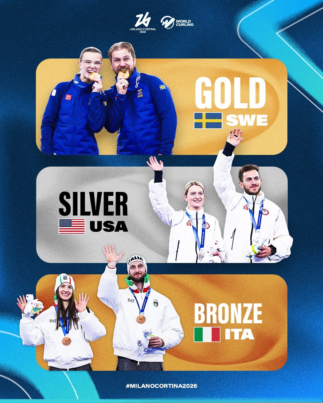 米兰冬奥会冰壶混双项目,瑞典组合弗拉纳兄妹6-5战胜美国队,队史首夺冬奥会冰壶混双冠军,卫冕冠军意大利队5-3击败英国队收获铜牌