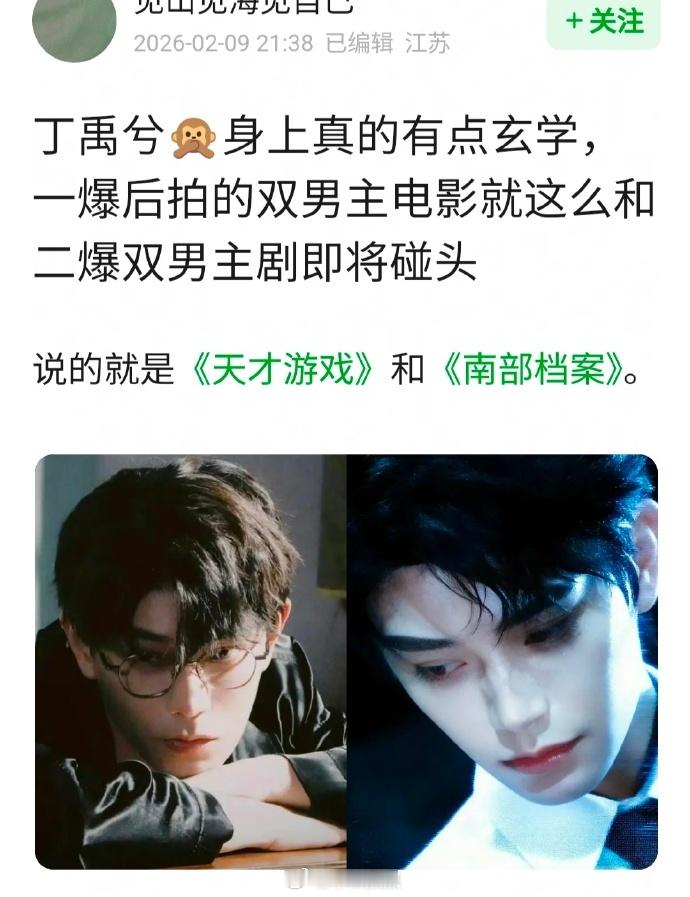 丁禹兮🙊身上真的有点玄学,一爆后拍的双男主电影就这么和二爆双男主剧即将碰头