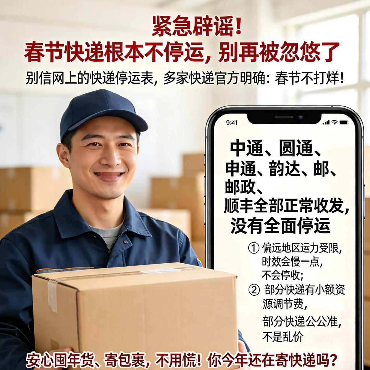 紧急辟谣!春节快递根本不停运,别再被忽悠了 别信网上的快递停运表,多家快递官方明确:春节不打烊! ① 中通、圆通、申通、韵达、邮政、顺丰全部正常收发,没有全面停运。 ② 只有偏远地区运力受限,时效会慢一点,不会停收。 ③ 部分快递有小额资源调节费,不是乱涨价,以网点公告为准。 安心囤年货、寄包裹,不用慌!你今年还在寄快递吗? 春节快递不打烊 辟谣 过年必备如何看待多家快递公司辟谣“春节快递停运” 春节快递 停运快递 春节放快递 物流停运表 物流停运 春节快运 快递停运预警