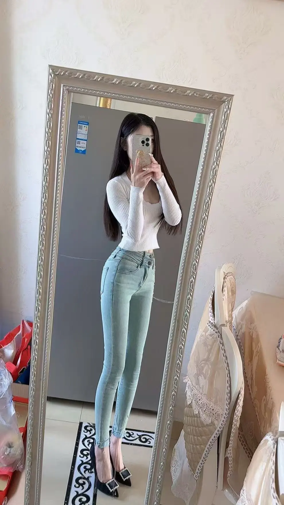 什么样的穿搭可以成为气质女神?小清晰牛仔裤,搭配白色小衫。气质美美哒。