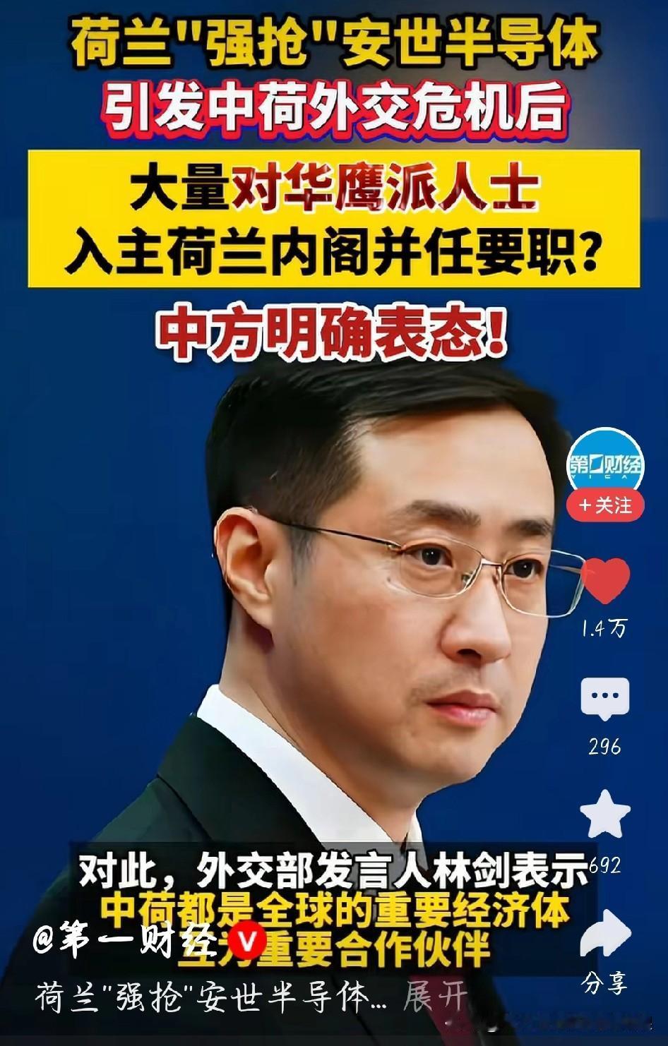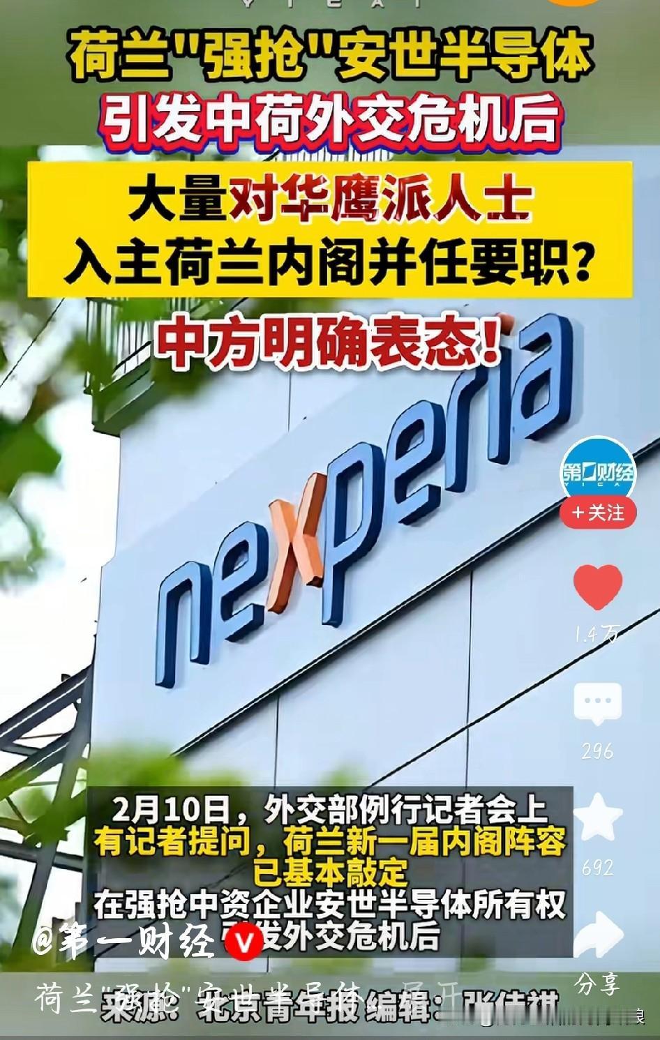 对华鹰派涌入荷兰新内阁,中方直接表态:别被极端带偏! 荷兰新内阁刚出炉荷兰新一届内阁名单公布,多名对华鹰派人士进入核心岗位,对华强硬姿态明显,一度引发外界对中荷关系的担忧。面对这一变化,中方正式作出回应。 中方表示,中荷互为重要经贸伙伴,互利合作才是正道。希望荷兰新政府秉持客观理性,摒弃对抗思维,通过对话妥善处理分歧,不要被极端立场绑架。 国家关系不是靠强硬表态就能走稳,务实合作才符合双方真正利益。奉劝荷兰新内阁看清大势,少搞政治操弄,多做有利于两国关系健康发展的事。 中方回应对华鹰派涌入荷兰新内阁 安世半导体 图片截图于网络