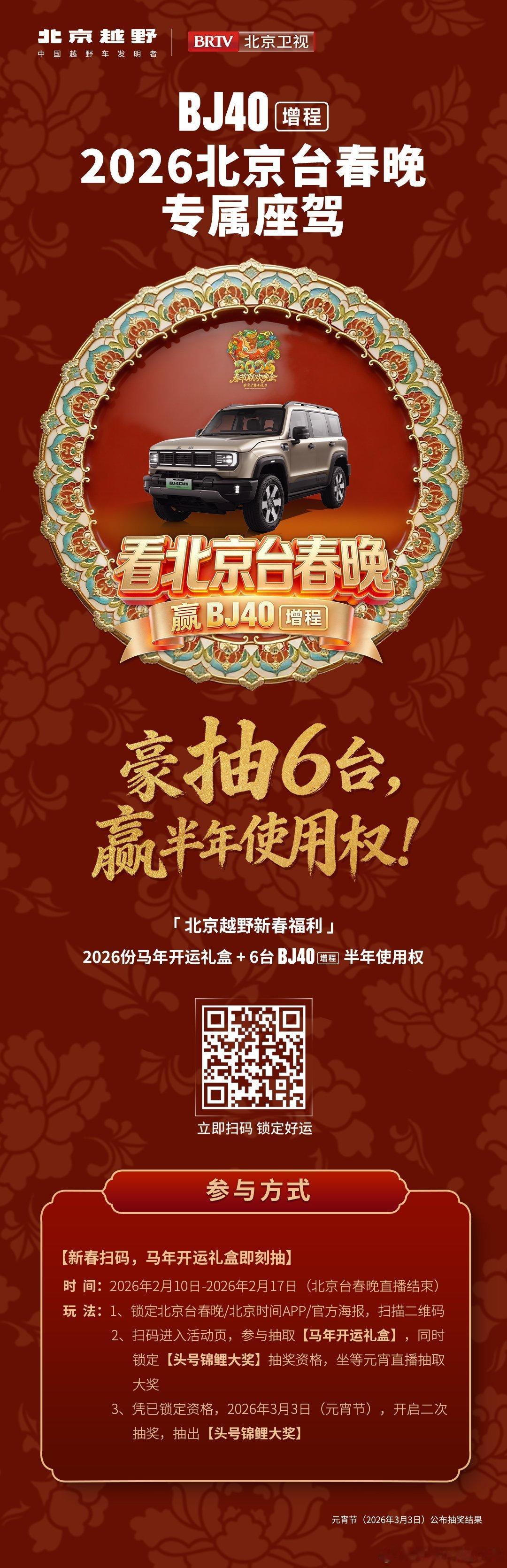 北京越野新春送大礼6台BJ40增程半年使用权等你来抽锁定北京卫视春晚下一个锦鲤就是你马年开赤兔好运挡不住