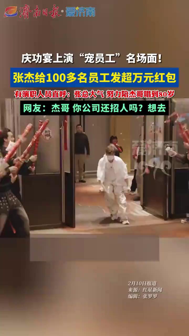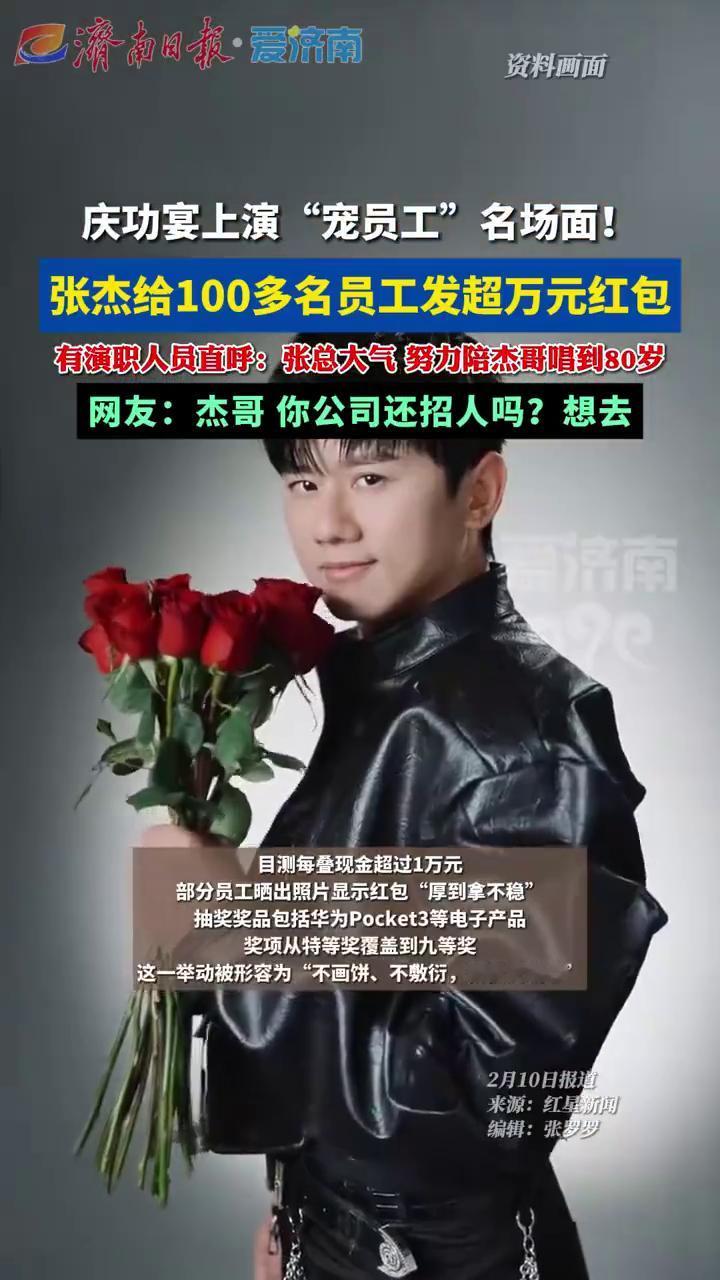 庆功宴上演"宠员工"名场面!张杰给100多名员工发超万元红包,有演职人员直呼:张总大气努力陪杰哥唱到80岁。 济南日报·爱济南。 网友:杰哥你公司还招人吗?想去。 张杰在"未LIVE开往1982巡回演唱会"成都新春场圆满结束后,于2月9日晚举办庆功宴。现场不仅发放现金红包,还设置了抽奖环节。部分员工晒出照片显示红包"厚到拿不稳",抽奖奖品包括华为Pocket3等电子产品,奖项从特等奖覆盖到九等奖。这一举动被形容为"不画饼、不敷衍,实在又暖心"。