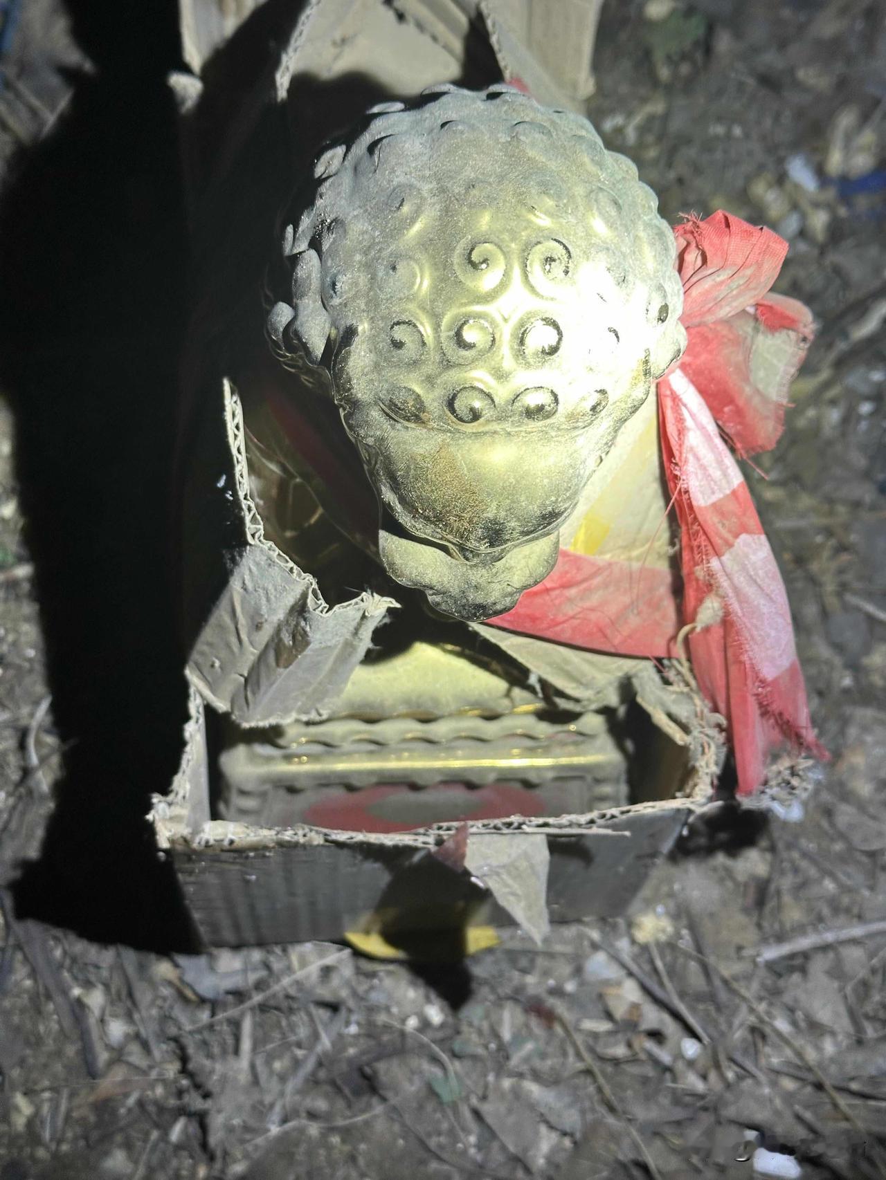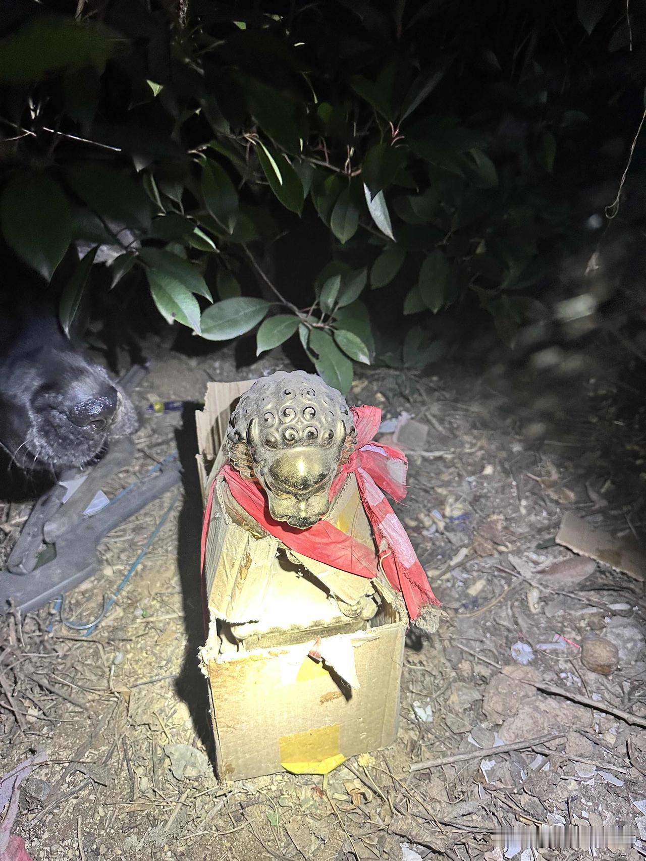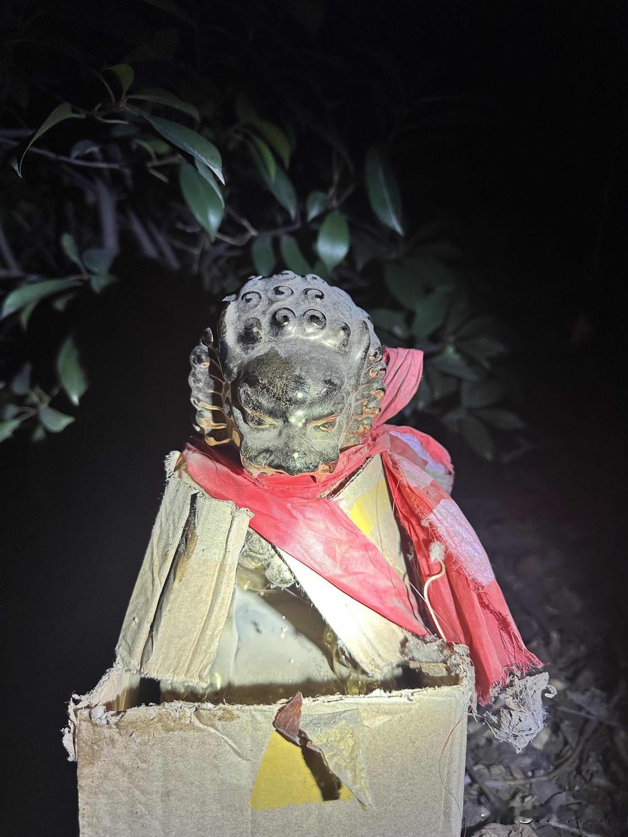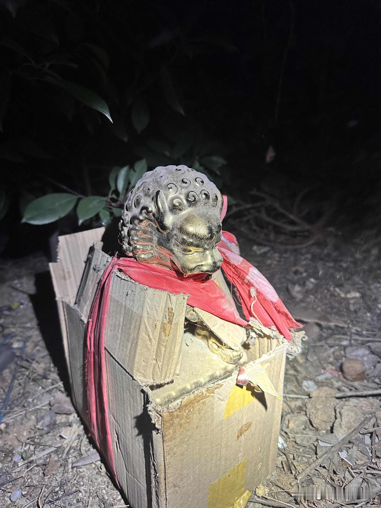 草丛中发现这个东西,这是啥? 今天半夜又是往常一样带我家狗子去河边散步,狗子在河边的草丛里一直闻,我好奇就钻了过去,用手电筒一照差点没给我吓尿(貌似是个金色的狮子,被放的很隐蔽,被塞在草丛里,如果不是狗子发现一般人真看不到。狮子像是陶瓷或者金属材质,然后奇怪的就是狮子放在纸箱里,漏出头,还用红布条绑着,然后底部应该是有个方形的底座,里面不知道有没有东西)。 我虽然不知道这是做什么用的但是肯定有人故意而为之,存有敬畏之心,没敢再研究或打开,把它放到了原有的位置就回家了。 求助广大网友谁知道这到底是什么东西?以及它的用途…