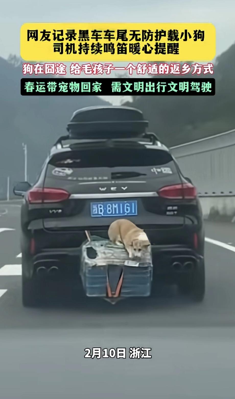 返乡的高速路上,这个粗心的主人完全不知道,后备箱外的狗狗,正处于危险之中。 狗子应该是自己钻出来了 却回不去 后车只好鸣笛提醒 希望狗仔没有事 否则的话 后果不堪设想呀