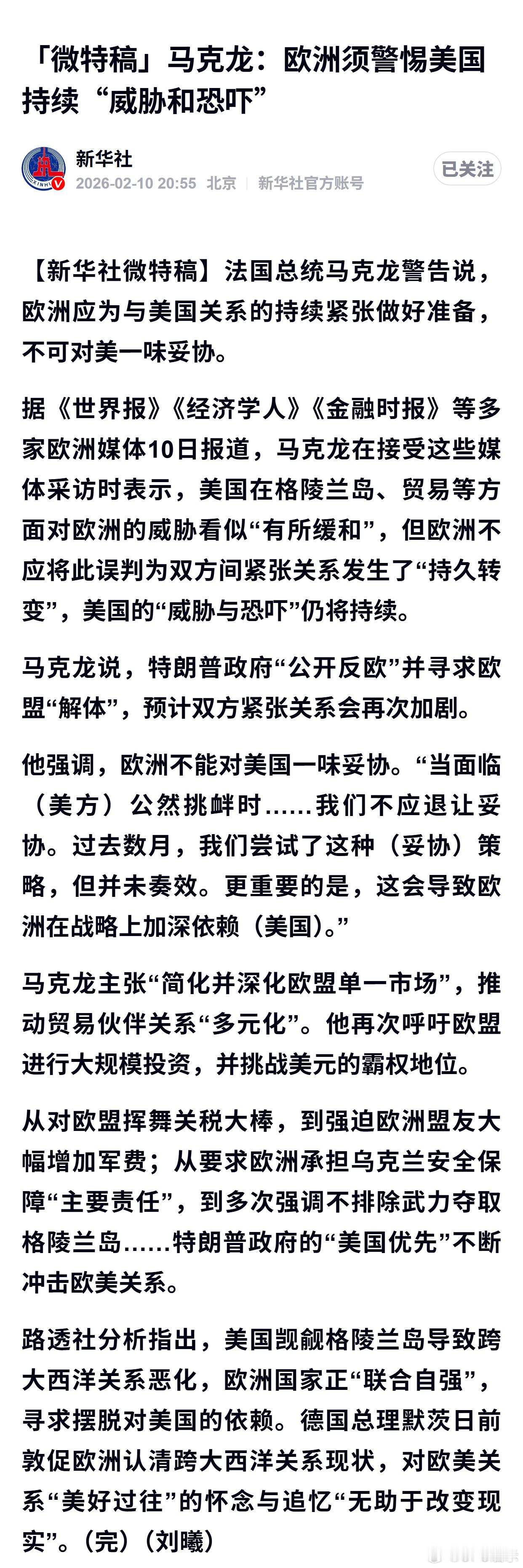 马克龙:欧洲须警惕美国持续“威胁和恐吓”