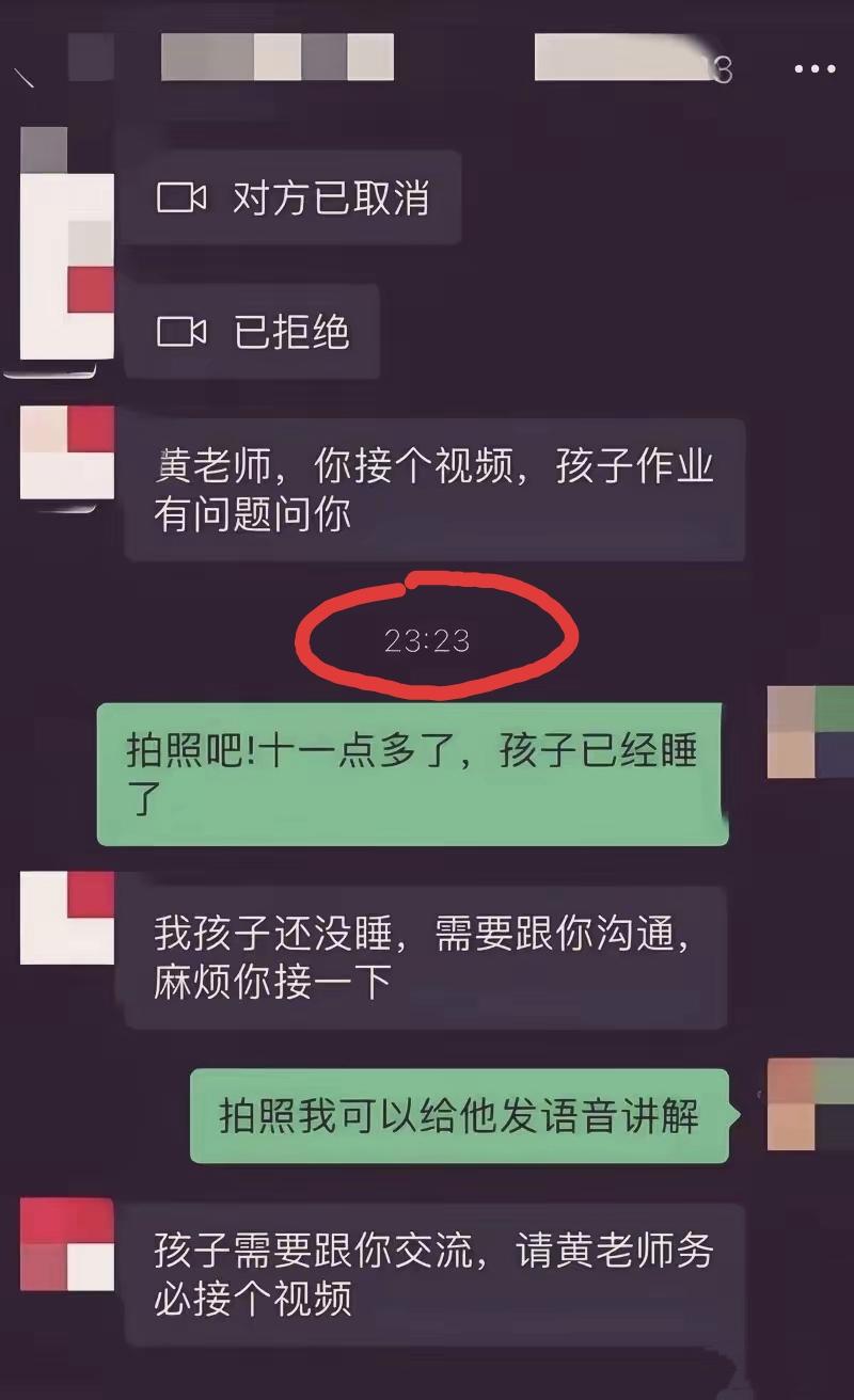 遇到这样的家长,你会怎么做?都深夜十一二点了,还来要求老师视频连线给学生讲解做不出来的试题。说好的边界感呢? 这种情况一开始就直接别回,第二天直接说昨天睡了调成静音了,只要回了这种家长就开始道德绑架了。 教师也是人,也是有家庭的,也是需要休息的。这本质上不是沟通问题,而是权力与尊重的博弈。 黄老师的几次拒绝(先是拒接,后是提议替代方案)是在坚守一个职业人应有的时间边界和个人空间,值得理解和支持。 这件事也反映出一种令人担忧的社会现象:部分家长将教育视为“购买的服务”,认为老师应当随时响应。这既不利于孩子的健康成长(学不会等待和尊重规则),也日益加剧了教师的职业倦怠。 说好的边界感呢?你们说是不是?如果是你,你会怎么做?