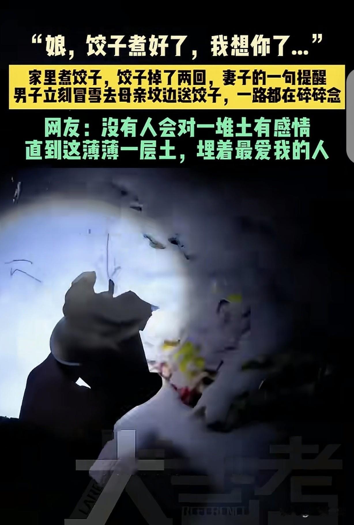 “这一番话听哭多少人?”河南,一男子把煮好的饺子往盘子里盛,可奇怪的是,饺子掉地上2次,妻子念叨了一句:是不是娃奶奶想吃饺子了?男子瞬间泪目,他端着饺子冲进风雪里,跑到母亲坟前送饺子,男子对亡母说的一番话,听得人泪如雨下。网友:直到自己妈妈躺在那里,天再黑也不怕了,没人会对一堆土有感情,直到这薄薄一层土,埋着自己最爱的人! 河南的冬天,雪都下冒烟了,风刮在脸上跟小刀子似的。 男子看外面那么冷,他馋饺子了,就吩咐妻子剁肉和面,两口子窝在家里包饺子,河南这边把饺子叫“扁食”。 男人擀皮儿妻子包馅,聊着家长里短,两口子分工明确,你擀我包,很快就包完了,锅里的水也烧开冒泡。 第一锅扁食刚捞出来,男人往盘子里盛的时候,不知道咋回事,扁食接连掉了2个在地上。 男子唠叨着,这是咋回事呀?妻子瞅着地上的饺子,嘴里随口说了一句:是不是娃奶奶也想吃了? 这话刚说完,男人手里的盘子就顿住了,娘走的时候也是个冬天,那时候娘还能坐在炕边上,看着他俩包扁食,说自己牙口不好,就爱吃扁食,然后再喝碗饺子汤暖身子,这叫原汤化原食。 男子没搭腔,转身找了个干净的一次性纸杯,装满热气腾腾的扁食,又倒了半碗饺子汤,就冲出门。 外面正下着大雪,风也刺骨,路上还结着薄冰,他深一脚浅一脚往村头的坟地跑,羽绒服领口灌进来的冷风也顾不上理。 到了娘的坟前,他蹲下来把装饺子的纸杯放在墓碑前,他跟母亲唠起嗑来:“娘,俺们今天在家包扁食呢?刚下第一锅。你儿媳妇说,是不是您想吃了?我就给你送来了。” “您离的近,以后想吃啥了,给我托个梦就行,咱娘俩离得恁近。” 这话一说出口,他再也忍不住了,捂着嘴蹲在地上哭。以前总觉得坟头就是一堆土,可自从娘埋在这里,每次路过都忍不住多瞅两眼,这堆土里埋着他的娘,是那个从小把他护在身后,给他煮鸡蛋缝棉袄的人。 风把雪沫漫天飞,像是娘伸手摸了摸他的头。 他在坟前待了好久,直到碗里的饺子凉透了,才慢慢站起来往家走。路上雪更大了,可他心里却暖乎乎的,他知道,娘肯定吃到饺子了。 有人说,想妈妈了,不知道妈妈在那边缺不缺啥,要记得托梦告诉我。一个男人最疼你的那个女人是娘!还有儿女媳妇! 40岁的人,看到这个眼泪就在眼眶里打转,不能掉下来。男子有一个好妻子,婆婆虽然不在了,饺子掉两次就能想到故去的婆婆。 这就是为啥过年都要回家的,因为家里住着曾经最爱自己的父母。 趁父母健在好好的孝顺自己的父母,父母在人生尚有来处,父母去人生只剩归途!祝愿天下所有的父母都能健康长寿! 我妈妈走了,我爸爸还在,等我爸要走的那天,我想和他约定等我走的那天,让他和我妈来接我! 以前去坟地总害怕,直到看到一句话就不怕了:你所害怕的鬼,都是别人思而不得见到的亲人。 自从再也没有喊出娘,就再也没有梦到过!每年清明,七月十五,十月初一,春节每年都去祭奠,一次也没有梦到过!现在越来越模糊,每次都在坟头点上三支烟!一晃十多年啦!去年清明节用小推车推了20车土,添坟,坟头刚种的花儿,一点也没有发芽!今年春天在种一些! 《民法典》第994条规定:死者的姓名、肖像、名誉、荣誉、隐私、遗体、遗骸等受到侵害的,其配偶、子女、父母有权依法请求民事责任。 法律虽是理性的条文,但也守护着感性的底线。 男子在风雪中奔向墓碑,行为本质上是行使祭奠权,这是基于血缘关系产生的一种特殊人格权利,也是公序良俗的重要组成部分。 男子对亡母的牵挂与网友对“那堆土”的感慨,背后是社会对孝道文化的高度认同。 法律守护的不仅是死者的安宁,更是生者寄托哀思、维系家族情感的心理防线。 对于这件事,你怎么看? 欢迎关注@一案一论