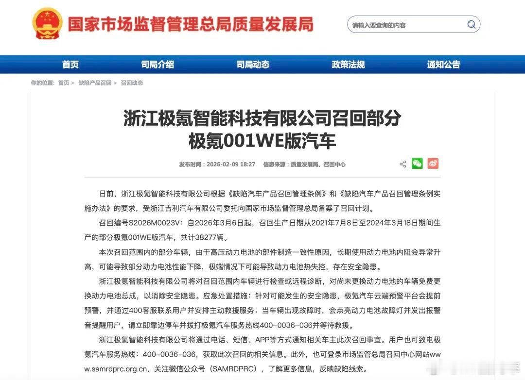 蔚来极氪 最新的召回公告。蔚来的召回是因为特定情况下会黑屏,召回2018年3月16日至2023年1月16日期间生产的ES8、ES6和EC6纯电动汽车,共计246229辆,主要是通过OTA解决。极氪的召回是因为电池有热失控风险,召回生产日期从2021年7月8日至2024年3月18日期间生产的部分极氪001WE版汽车,共计38277辆,需要更换电池总成。