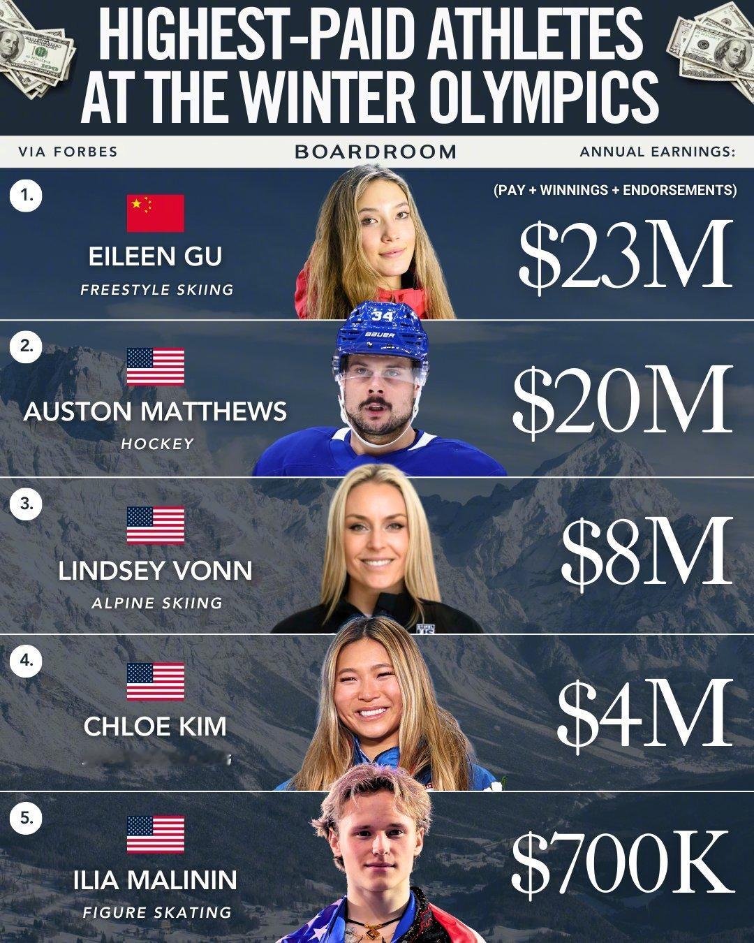 福布斯关于冬奥运运动员收入排名的统计!谷爱凌2300年美元第一,NHL球星Auston Matthews则是2000万美元排在第二。第五名都只能以K为单位的70万美元。