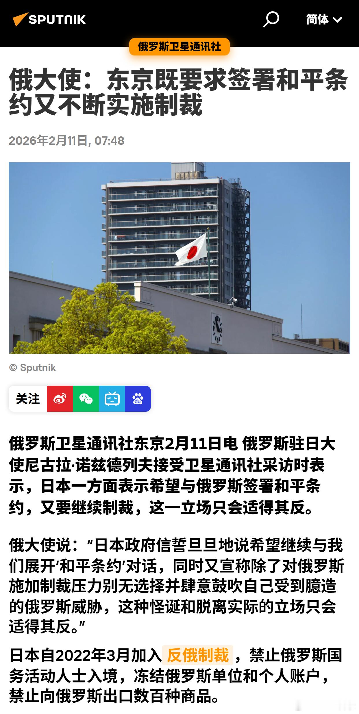 俄大使:东京既要求签署和平条约又不断实施制裁
