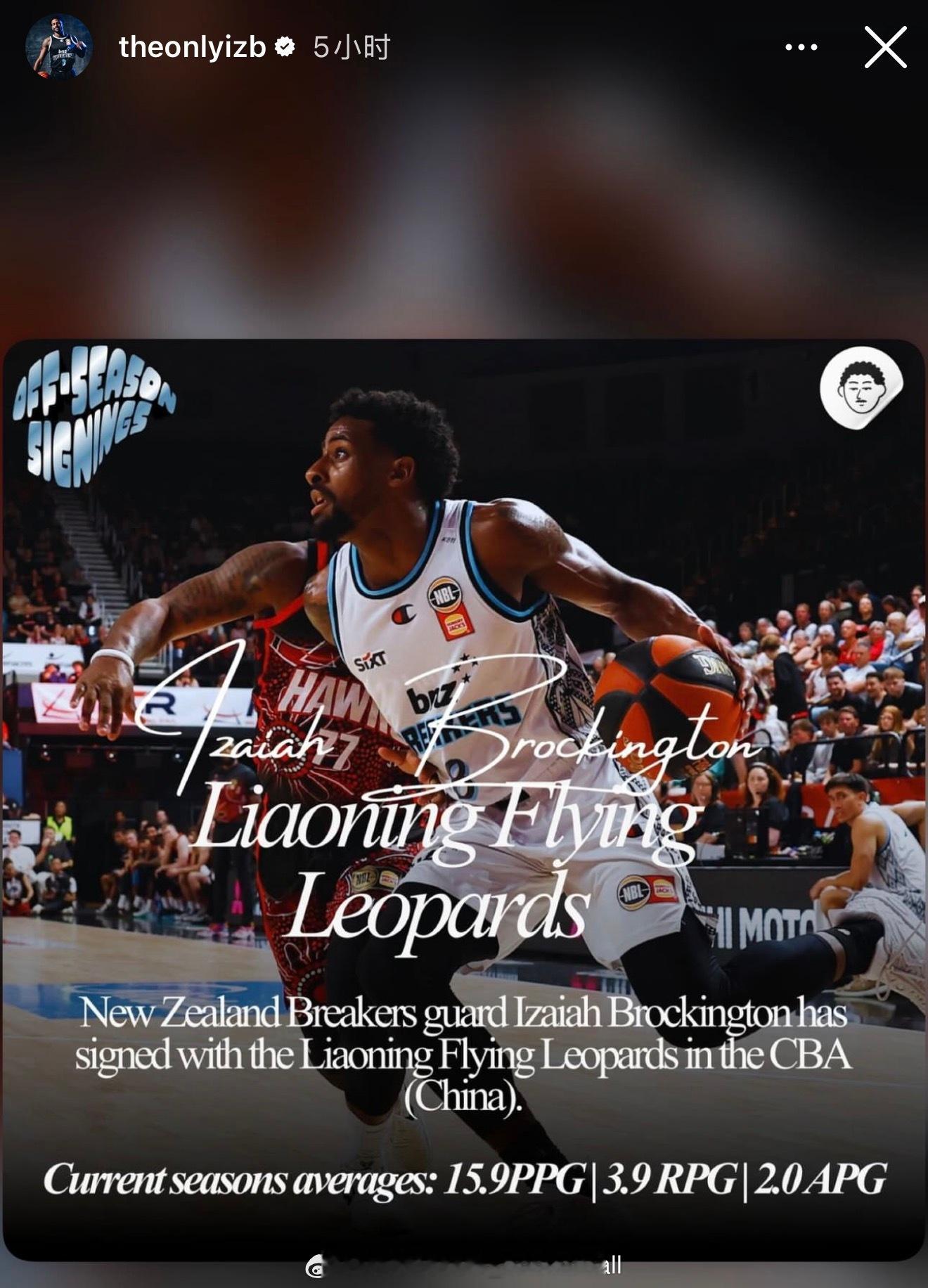确定加盟,艾泽亚·布罗金顿在社交媒体上转发了自己加盟辽宁男篮的新闻,他所在的新西兰破坏者的最后一场比赛是在2月22日对阵阿德莱德36人