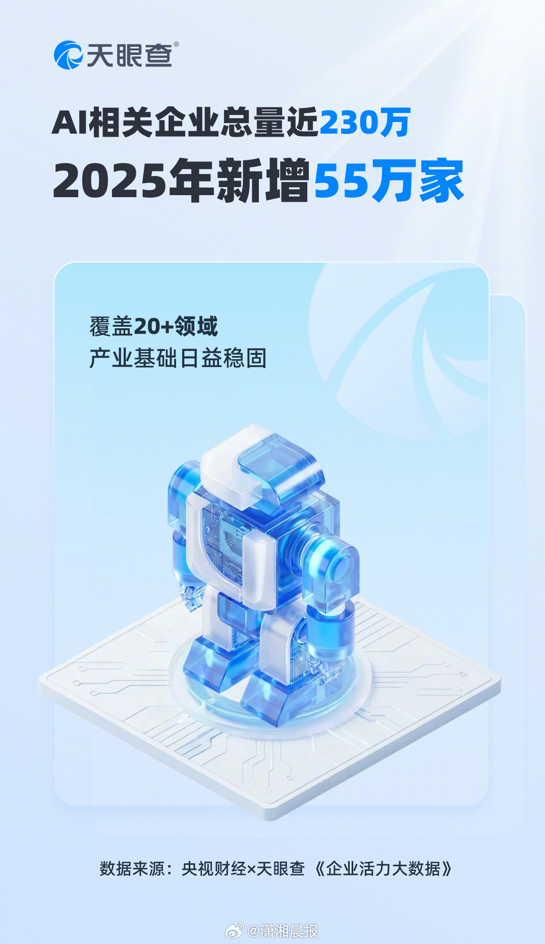 #长沙拥有超5万家AI相关企业#【#AI相关企业一年新增55万家#】近日,央视财经与天眼查联合发布《企业活力大数据》,数据显示,截至2025年,我国人工智能相关企业总量已接近230万家,其中2025年新设立企业超55万家,较2024年同期增长32.6%。这些企业广泛覆盖智能制造、智能交通、智能医疗、智能安防等多个核心领域,产业基础日益稳固。