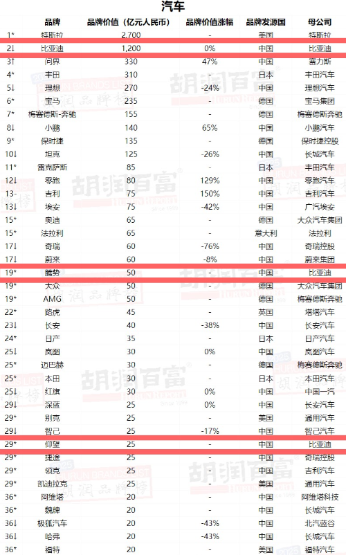 2月3日,比亚迪第四次登顶,在规则调整之后,2025胡润汽车品牌榜出炉。 根据榜单显示,比亚迪以1200亿元品牌价值连续四年蝉联中国汽车品牌第一名。这也意味着,比亚迪在此前的付出得到了回报,市场广泛认可比亚迪品牌,这也为接下来拓展更多市场提供了坚实的基础。
