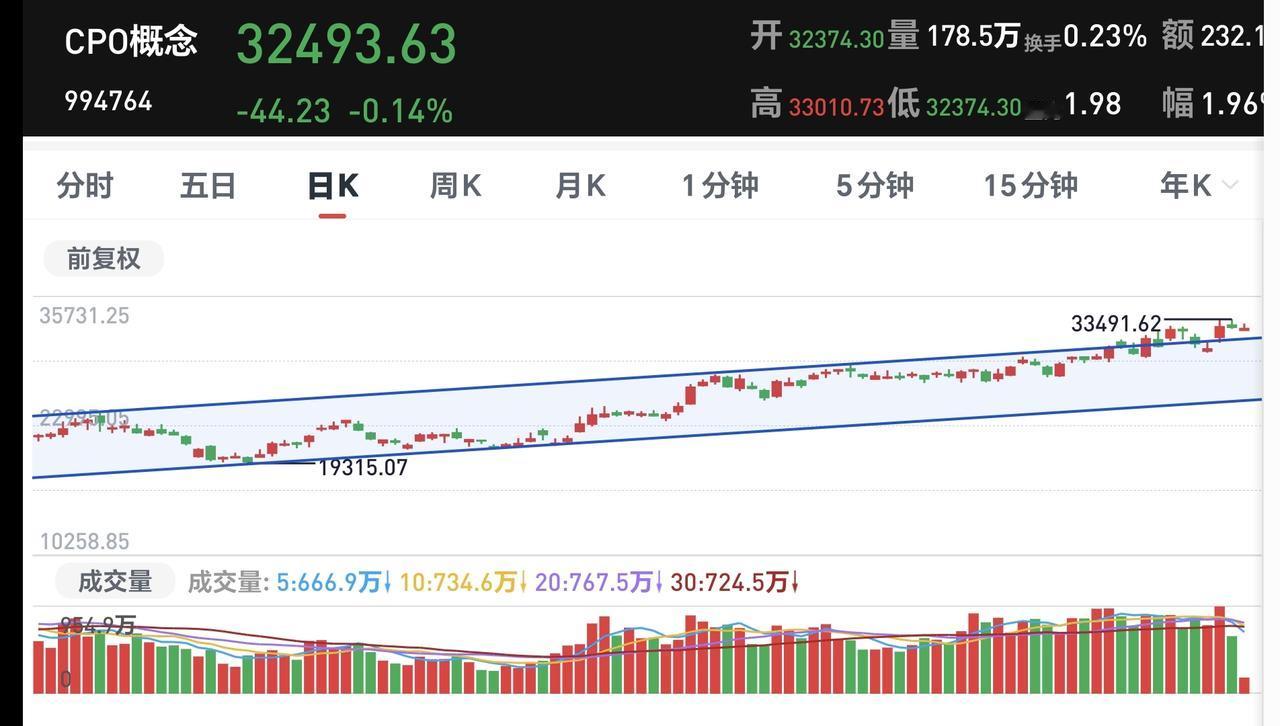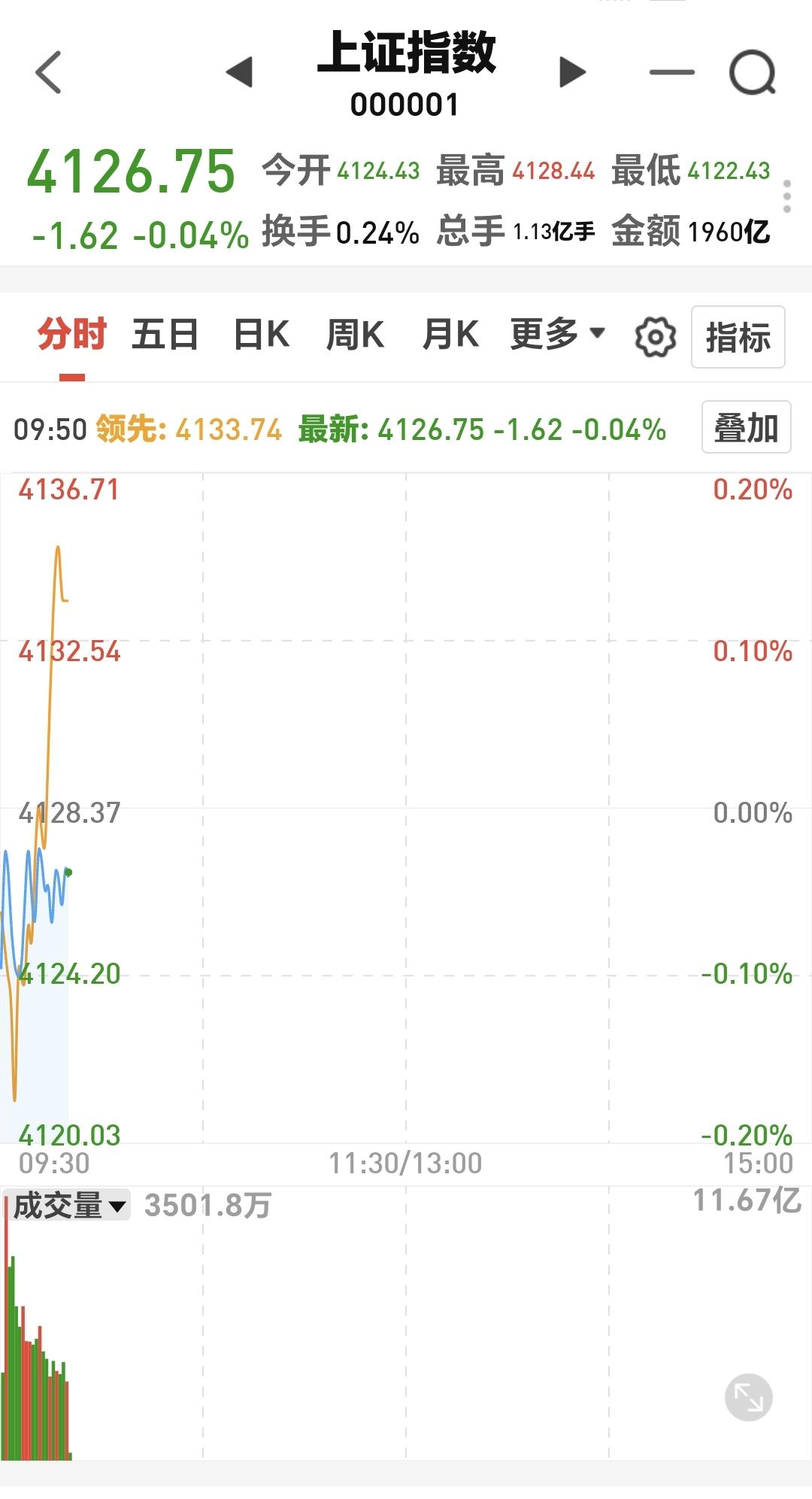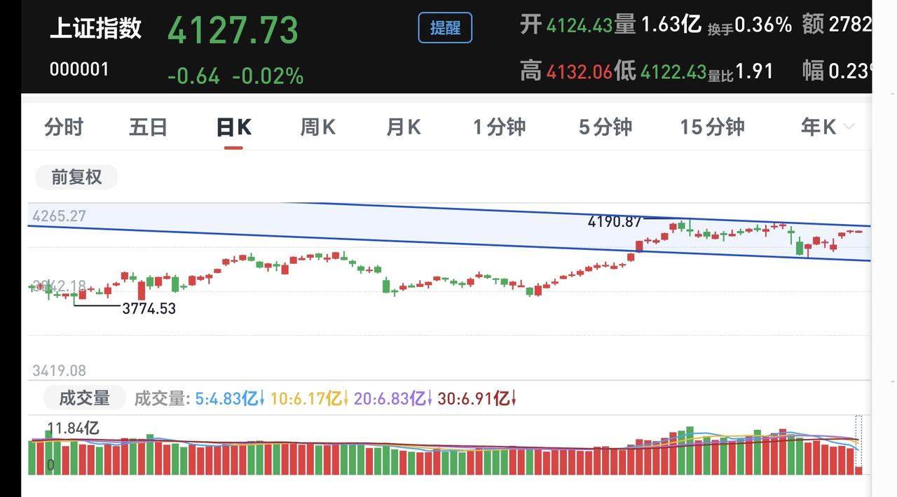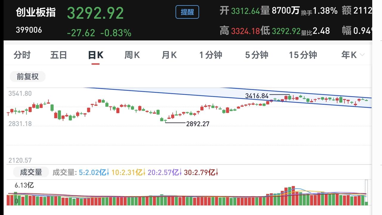 基金:市场指数盘中震荡,为什么不需要担心 今天市场低开,三大指数都是低开,创业板指开盘下跌了0.24%,开于3312点,上证指数开盘下跌了0.10%,开于4124点。 开盘以后指数小幅度震荡,但黄色线在蓝色线上方,两条线之间的敞口比较大, 从这个方面看,市场指数有进一步上涨的可能性,但现在两市累计成交只有5120亿,相比于昨天同期缩量的16%,这个话缩量幅度还是比较大的,从这个方面看,今天即使有上涨,也不会幅度很大,整体上还是判断为震荡走势。 市场上涨2600多家,下跌2500多家,上涨家数略微多于下跌家数,涨停34家,跌停7家,主力资金净流出92亿。 主力资金净流入最多的三个板块是:建筑材料,有色金属,稀有金属,主力资金净流出最多的三个板块是,传媒板块,国企板块,高端制造板块。 市场上涨幅度最大的三个板块是:稀土永磁板块,有色金属板块,黄金板块,下跌幅度最大的三个板块是:cpo板块,煤炭板块,双创50板块。 CPO板块已经连续下跌了2个交易日,今天的下跌并没有跌破日线级别的上涨通道,现在还是处于日线级别上涨通道的上方,这个板块还是处于日线级别上涨趋势中,持有的人可以继续持有。 Cpo板块连续2个交易日的下跌,也没有跌破周线级别上涨通道的下轨线,现在还是处于周线级别上涨通道中,长线持有的人可以继续持有。 稀土永磁板块已经连续上涨了4个交易日,但这样的上涨并没有改变周线级别的上涨趋势,现在还是处于周线级别的上涨通道中,没有能够上涨突破上涨通道的上轨线进入加速上涨,长线持有的人可以继续持有。 今天上午指数应该是小幅度震荡,需要注意的应该是下午的走势,下午的震荡幅度会加大,因为今天有些人需要从市场里面挪出资金,还有些人需要防范长假期间的不确定性,对于我们半仓的人来说,只要喝茶看戏就可以了,如果上午盘中震荡向下,下午是有上拉的可能性,而且可能性很大,总之,今天就是一个小涨小跌的交易日,大涨大跌的可能性很小,大家不需要担心,因为黄色线是高高在上的。 我们再来看一下上证指数和创业板指的情况,现在他们都是处于日线级别,短期下跌通道中,今天小幅度的震荡并没有能够改变它们的日线级别短期下跌趋势,因为,他们并没有能够上涨突破日线级别短期下跌通道的上轨线,在上涨突破日线级别短期下跌通道的上轨线之前,都不要认为震荡已经结束,都不要认为市场的方向已经选择了向上。 持有的基金盘中估值亏损了5617元,估值上涨的只有创新药板块和新能源汽车板块,亏损金额最大的三个板块是:芯片半导体板块,创业板指,5G板块。 花一秒钟点赞,花30秒钟评论,就是对我最大的支持,谢谢大家的支持。