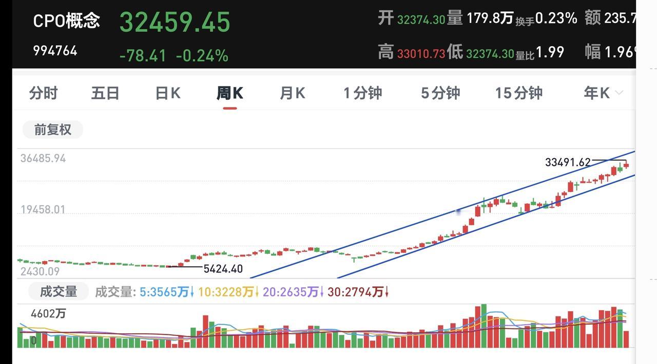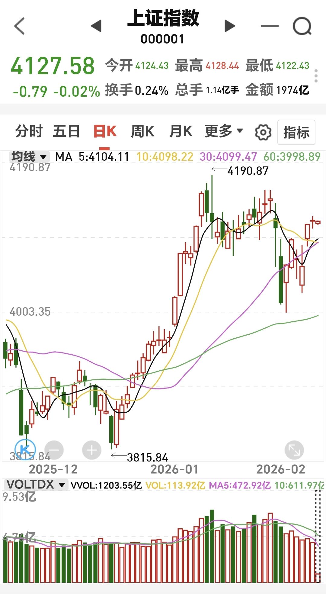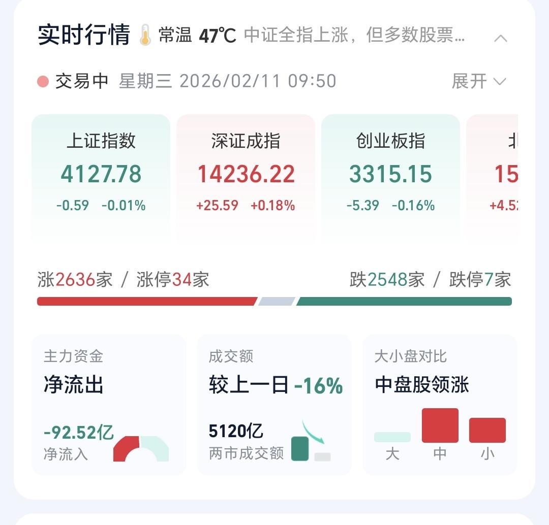 基金:市场指数盘中震荡,为什么不需要担心 今天市场低开,三大指数都是低开,创业板指开盘下跌了0.24%,开于3312点,上证指数开盘下跌了0.10%,开于4124点。 开盘以后指数小幅度震荡,但黄色线在蓝色线上方,两条线之间的敞口比较大, 从这个方面看,市场指数有进一步上涨的可能性,但现在两市累计成交只有5120亿,相比于昨天同期缩量的16%,这个话缩量幅度还是比较大的,从这个方面看,今天即使有上涨,也不会幅度很大,整体上还是判断为震荡走势。 市场上涨2600多家,下跌2500多家,上涨家数略微多于下跌家数,涨停34家,跌停7家,主力资金净流出92亿。 主力资金净流入最多的三个板块是:建筑材料,有色金属,稀有金属,主力资金净流出最多的三个板块是,传媒板块,国企板块,高端制造板块。 市场上涨幅度最大的三个板块是:稀土永磁板块,有色金属板块,黄金板块,下跌幅度最大的三个板块是:cpo板块,煤炭板块,双创50板块。 CPO板块已经连续下跌了2个交易日,今天的下跌并没有跌破日线级别的上涨通道,现在还是处于日线级别上涨通道的上方,这个板块还是处于日线级别上涨趋势中,持有的人可以继续持有。 Cpo板块连续2个交易日的下跌,也没有跌破周线级别上涨通道的下轨线,现在还是处于周线级别上涨通道中,长线持有的人可以继续持有。 稀土永磁板块已经连续上涨了4个交易日,但这样的上涨并没有改变周线级别的上涨趋势,现在还是处于周线级别的上涨通道中,没有能够上涨突破上涨通道的上轨线进入加速上涨,长线持有的人可以继续持有。 今天上午指数应该是小幅度震荡,需要注意的应该是下午的走势,下午的震荡幅度会加大,因为今天有些人需要从市场里面挪出资金,还有些人需要防范长假期间的不确定性,对于我们半仓的人来说,只要喝茶看戏就可以了,如果上午盘中震荡向下,下午是有上拉的可能性,而且可能性很大,总之,今天就是一个小涨小跌的交易日,大涨大跌的可能性很小,大家不需要担心,因为黄色线是高高在上的。 我们再来看一下上证指数和创业板指的情况,现在他们都是处于日线级别,短期下跌通道中,今天小幅度的震荡并没有能够改变它们的日线级别短期下跌趋势,因为,他们并没有能够上涨突破日线级别短期下跌通道的上轨线,在上涨突破日线级别短期下跌通道的上轨线之前,都不要认为震荡已经结束,都不要认为市场的方向已经选择了向上。 持有的基金盘中估值亏损了5617元,估值上涨的只有创新药板块和新能源汽车板块,亏损金额最大的三个板块是:芯片半导体板块,创业板指,5G板块。 花一秒钟点赞,花30秒钟评论,就是对我最大的支持,谢谢大家的支持。