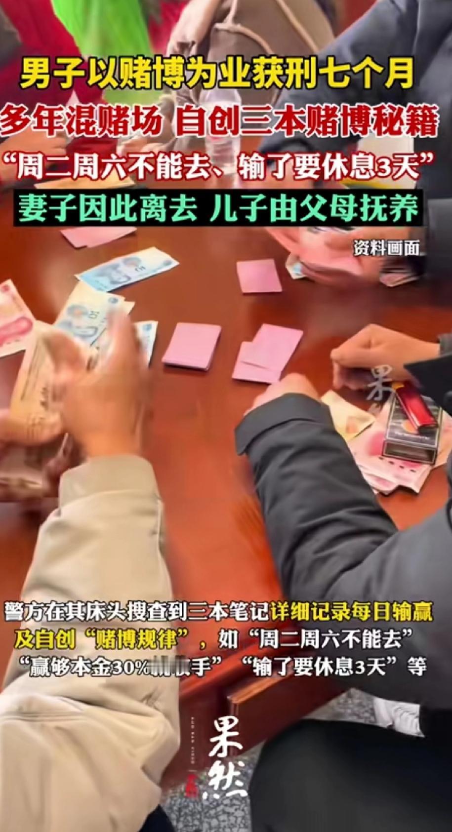 男子以赌博为业获刑七个月,多年混迹赌场,自创三本赌博秘籍。男子32岁“赌龄”长达15年,还自创三本“赌博秘籍”,像“周二周六不能去、赢够本金30%就收手”。 但这“秘籍”也没让他走上正途,反而让他“以赌博为业”,结果妻子离去,儿子只能由父母抚养。他到底靠赌博挣到钱没,又是自创赌博秘籍,看似安排合理,怎么媳妇跑了,孩子还让父母养着?总之赌博害人不浅,吃喝嫖赌抽,坑蒙拐骗偷,无论从事哪一项最终都要踩缝纫机。 想起了楼上的邻居因为赌博去年春节才出来,房子也输没了,妻子也离婚了,邻居总想一夜暴富。沾染了恶习,最终触犯法律,在牢里待了一年多才出来。 图文里男子最终被判处七个月刑罚。 在我国,以营利为目的聚众赌博或以赌博为业是违法的,会处三年以下有期徒刑等。 这男子把大好时光花在赌博上,还妄想靠“秘籍”获利,真是糊涂。赌博害人不浅,大家可千万别学他。