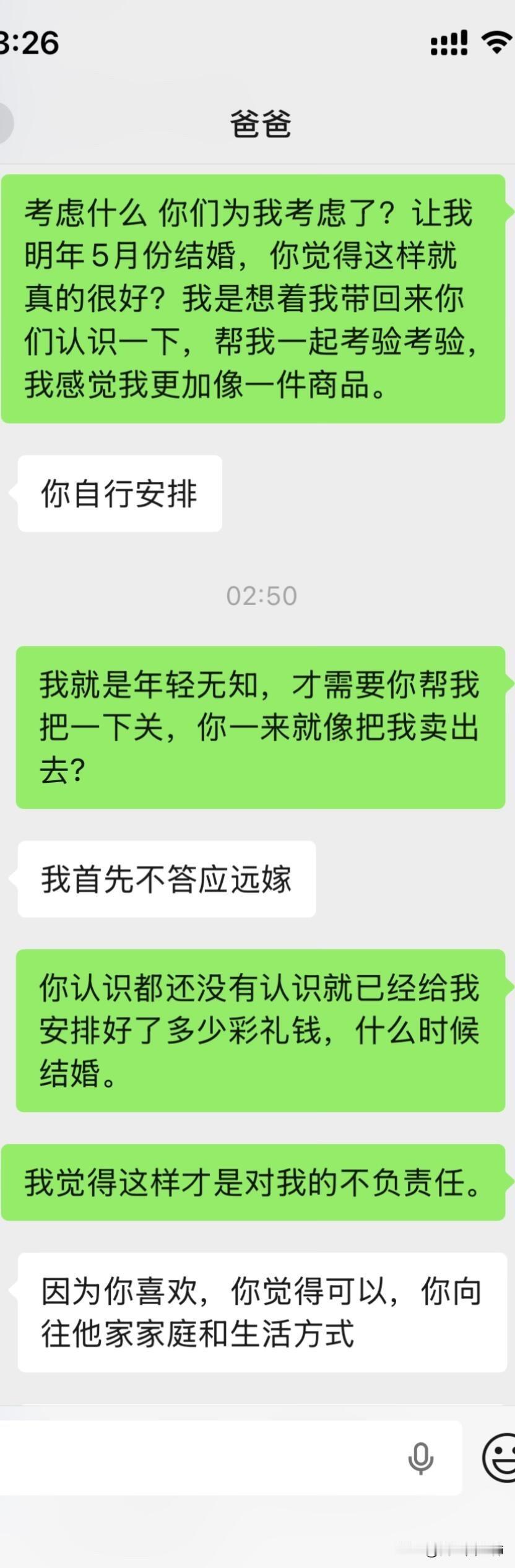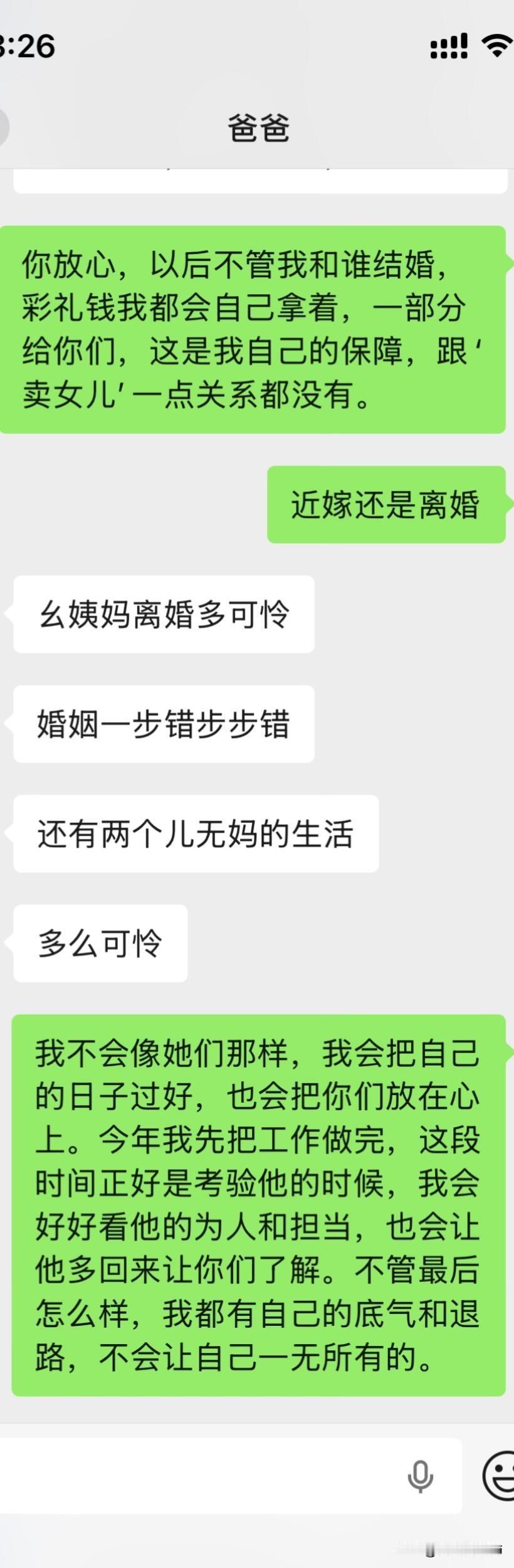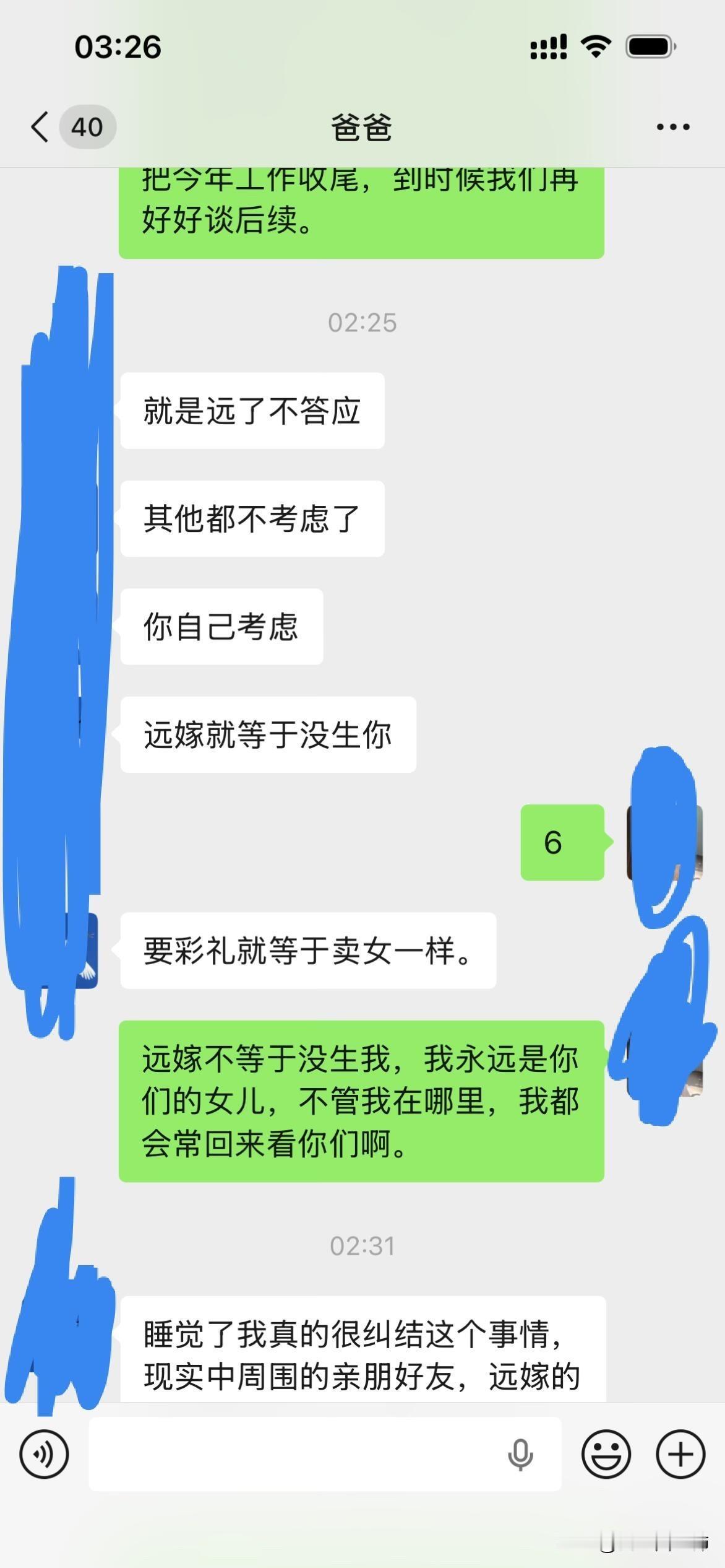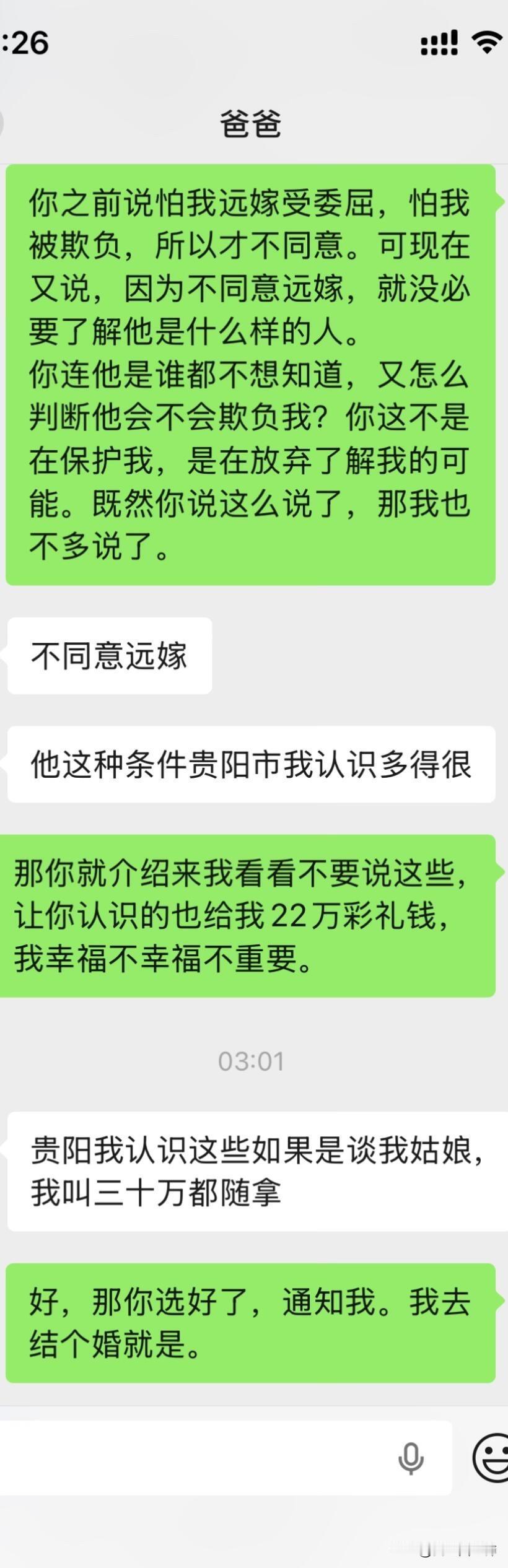 爸妈不同意远嫁后续 大晚上气死我了,上一篇贴子,很多姐姐给了我建议。刚刚又和我爸沟通了一下,真的越来越逆天了,让我男朋友家拿22万彩礼不陪嫁,钱给他们,真的是没法沟通。大家可以先看看上一篇贴子!!能不能都先看一下第一篇。好吧好的人只分析我想不想以后回家。 1.我是在很小大概1岁左右的时候我就被送到了我外婆家,那时候计划生育加上家里面经济特别困难,然后直到现在我都是在我外婆家,因为我和我爸妈也没有什么感情,我也不喜欢回去因为姐妹太多了也没有属于自己的房间,我一般都是回去个一两天就回来我外婆家了,我上学一直是在外婆家上学除了大学。 2.因为我经常去我男朋友家,因为工作就在四川离他家也近,时间久了他父母和他也想过来拜访一下我父母,加上开始我父母也同意他过来了,我刚开始确实想的不是很周到,因为我觉得见面介绍一下我男朋友也没什么,就算以后不在一起了说明没有缘分,不会觉得别人说我名声不好什么的。后面我爸爸又说不同意,我也改口说那就在家外面吃个饭也可以。 3.关于我男朋友给我找的工作,我是因为他的人脉进去的,但是我有这方面的经验工作确实可以做的很好,我可以自己在工作平台上站稳脚跟。 4.很多人劝我不要远嫁,我和我男朋友目前还没有立刻就结婚的想法,我们有这个打算,但是得一两年之后,我觉得见面一起吃个饭也没有什么。 5.我自己本人不想留在贵州发展,不知道什么原因我很想去远一点,我也不会想家,只要城市好利于我自己发展。 6.很多人让我回来贵州找工作,我是大专文凭,没有技术,没有人脉除了销售和服务员我可能找不到其他工作。最后很感谢大家给的建议,我都有看进去,我会在好好考虑一下的。