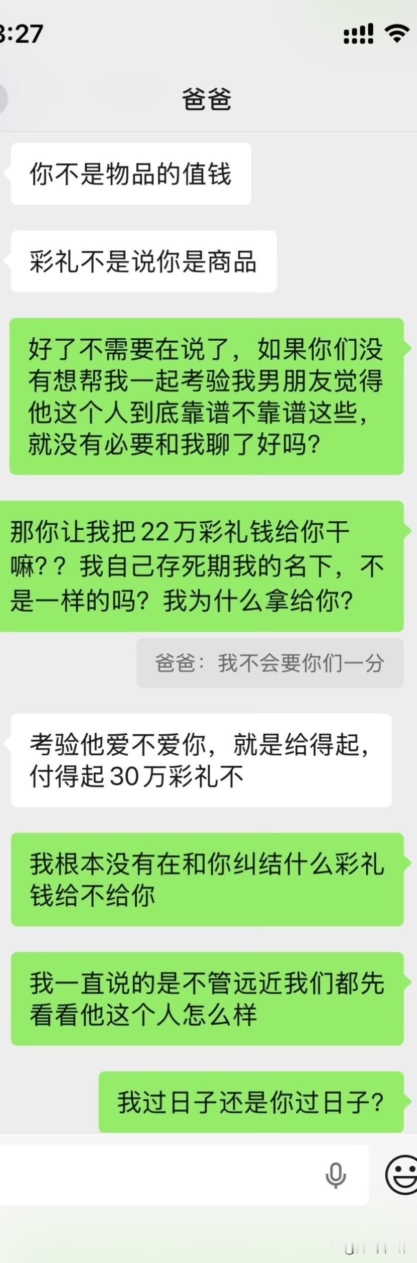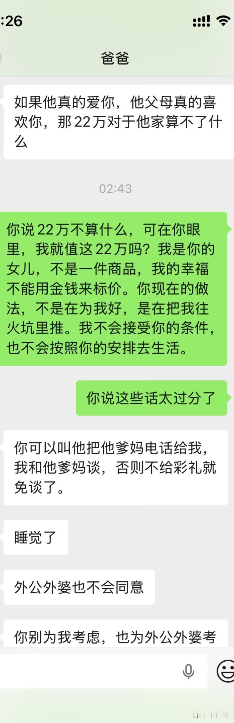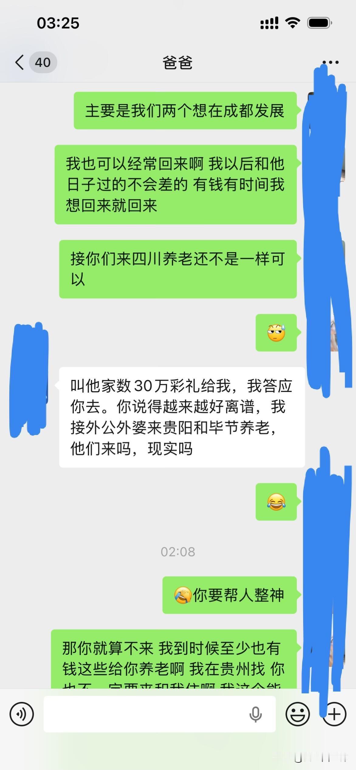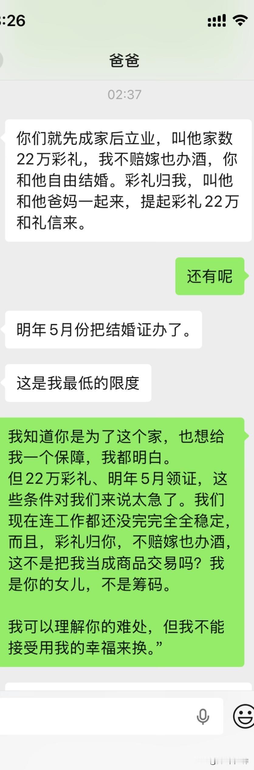 爸妈不同意远嫁后续 大晚上气死我了,上一篇贴子,很多姐姐给了我建议。刚刚又和我爸沟通了一下,真的越来越逆天了,让我男朋友家拿22万彩礼不陪嫁,钱给他们,真的是没法沟通。大家可以先看看上一篇贴子!!能不能都先看一下第一篇。好吧好的人只分析我想不想以后回家。 1.我是在很小大概1岁左右的时候我就被送到了我外婆家,那时候计划生育加上家里面经济特别困难,然后直到现在我都是在我外婆家,因为我和我爸妈也没有什么感情,我也不喜欢回去因为姐妹太多了也没有属于自己的房间,我一般都是回去个一两天就回来我外婆家了,我上学一直是在外婆家上学除了大学。 2.因为我经常去我男朋友家,因为工作就在四川离他家也近,时间久了他父母和他也想过来拜访一下我父母,加上开始我父母也同意他过来了,我刚开始确实想的不是很周到,因为我觉得见面介绍一下我男朋友也没什么,就算以后不在一起了说明没有缘分,不会觉得别人说我名声不好什么的。后面我爸爸又说不同意,我也改口说那就在家外面吃个饭也可以。 3.关于我男朋友给我找的工作,我是因为他的人脉进去的,但是我有这方面的经验工作确实可以做的很好,我可以自己在工作平台上站稳脚跟。 4.很多人劝我不要远嫁,我和我男朋友目前还没有立刻就结婚的想法,我们有这个打算,但是得一两年之后,我觉得见面一起吃个饭也没有什么。 5.我自己本人不想留在贵州发展,不知道什么原因我很想去远一点,我也不会想家,只要城市好利于我自己发展。 6.很多人让我回来贵州找工作,我是大专文凭,没有技术,没有人脉除了销售和服务员我可能找不到其他工作。最后很感谢大家给的建议,我都有看进去,我会在好好考虑一下的。