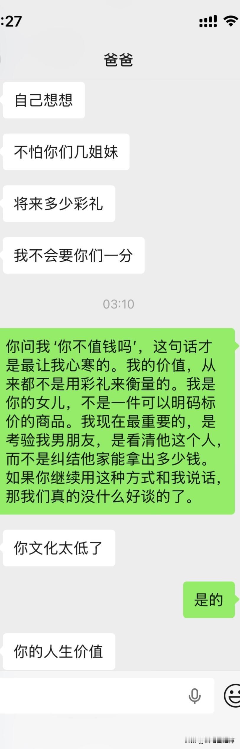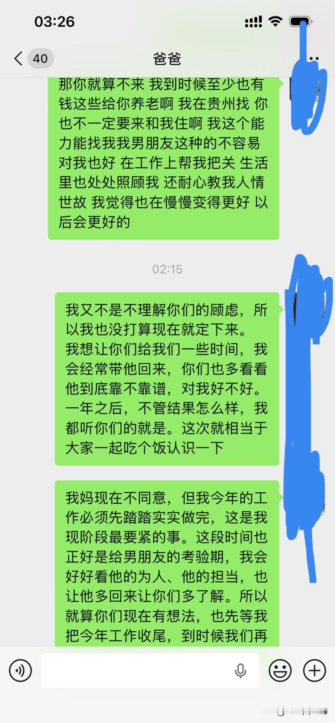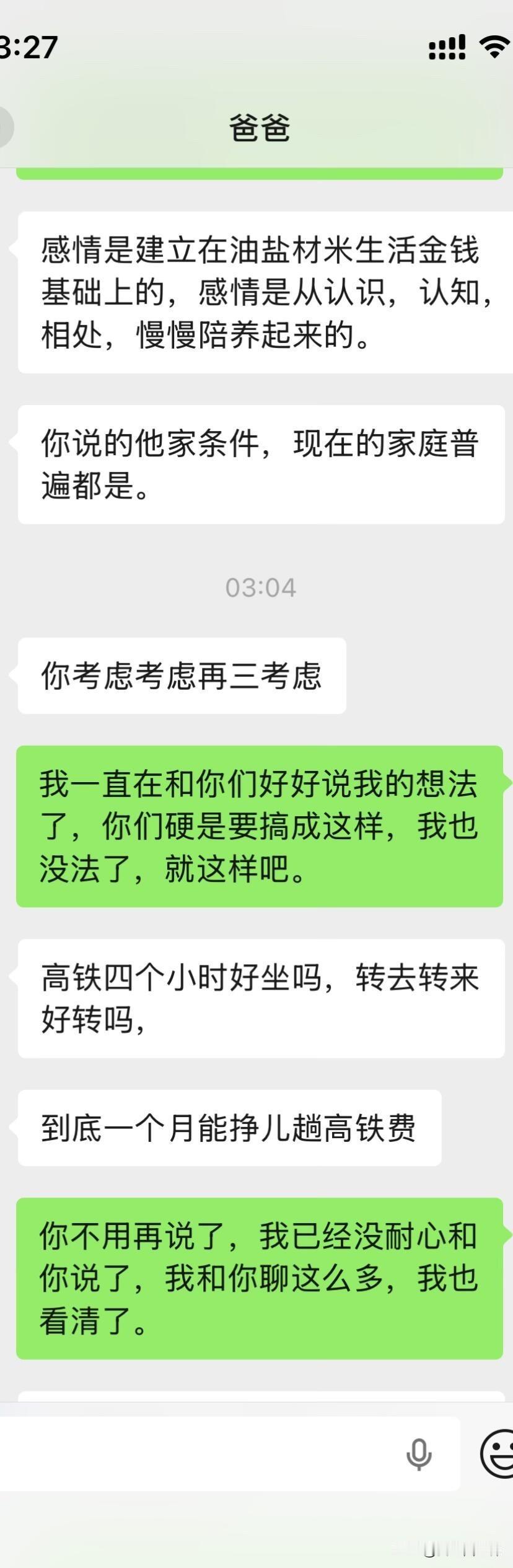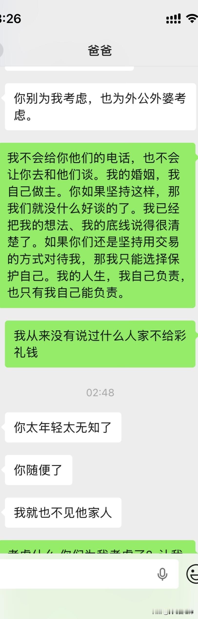 爸妈不同意远嫁后续 大晚上气死我了,上一篇贴子,很多姐姐给了我建议。刚刚又和我爸沟通了一下,真的越来越逆天了,让我男朋友家拿22万彩礼不陪嫁,钱给他们,真的是没法沟通。大家可以先看看上一篇贴子!!能不能都先看一下第一篇。好吧好的人只分析我想不想以后回家。 1.我是在很小大概1岁左右的时候我就被送到了我外婆家,那时候计划生育加上家里面经济特别困难,然后直到现在我都是在我外婆家,因为我和我爸妈也没有什么感情,我也不喜欢回去因为姐妹太多了也没有属于自己的房间,我一般都是回去个一两天就回来我外婆家了,我上学一直是在外婆家上学除了大学。 2.因为我经常去我男朋友家,因为工作就在四川离他家也近,时间久了他父母和他也想过来拜访一下我父母,加上开始我父母也同意他过来了,我刚开始确实想的不是很周到,因为我觉得见面介绍一下我男朋友也没什么,就算以后不在一起了说明没有缘分,不会觉得别人说我名声不好什么的。后面我爸爸又说不同意,我也改口说那就在家外面吃个饭也可以。 3.关于我男朋友给我找的工作,我是因为他的人脉进去的,但是我有这方面的经验工作确实可以做的很好,我可以自己在工作平台上站稳脚跟。 4.很多人劝我不要远嫁,我和我男朋友目前还没有立刻就结婚的想法,我们有这个打算,但是得一两年之后,我觉得见面一起吃个饭也没有什么。 5.我自己本人不想留在贵州发展,不知道什么原因我很想去远一点,我也不会想家,只要城市好利于我自己发展。 6.很多人让我回来贵州找工作,我是大专文凭,没有技术,没有人脉除了销售和服务员我可能找不到其他工作。最后很感谢大家给的建议,我都有看进去,我会在好好考虑一下的。
